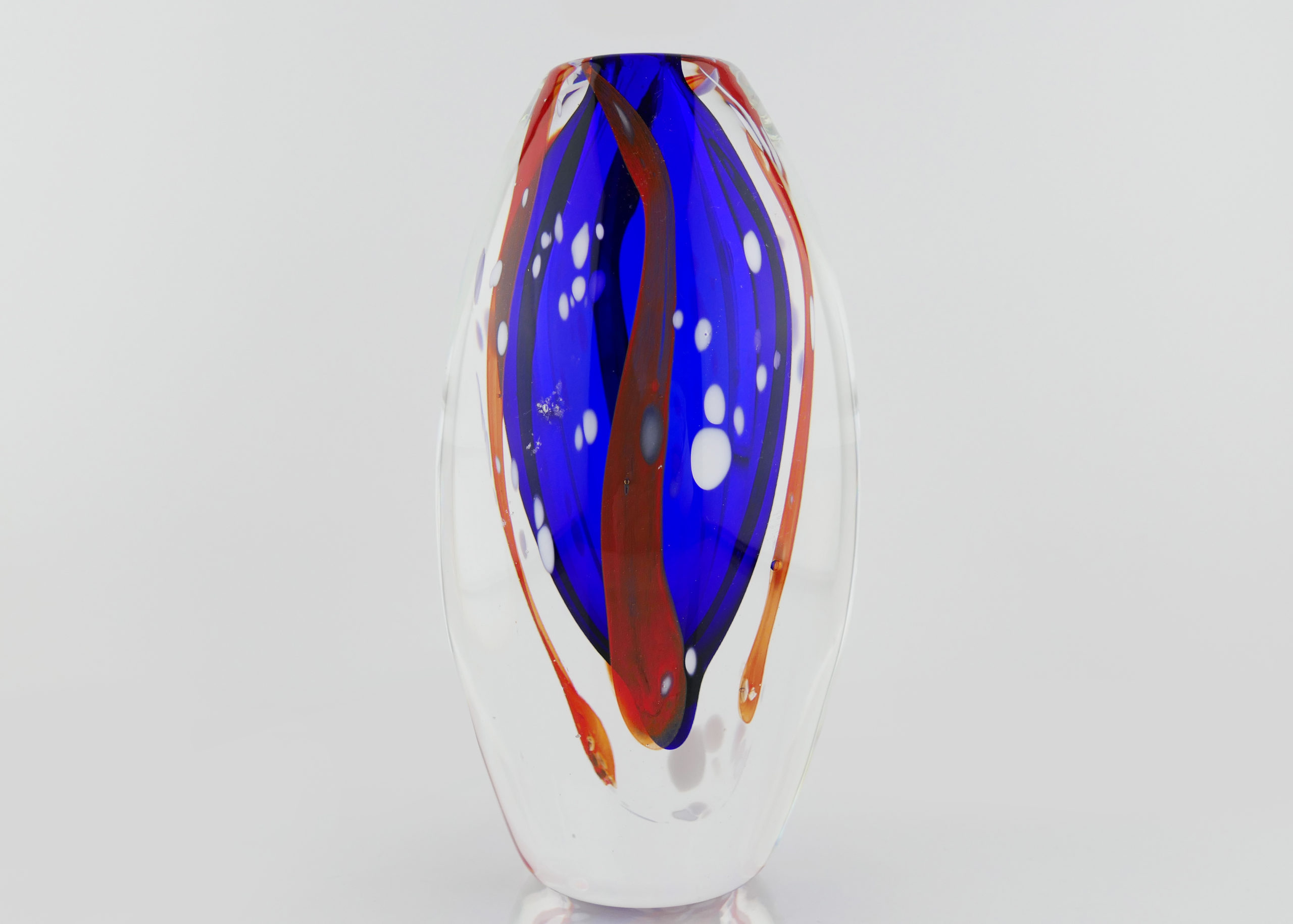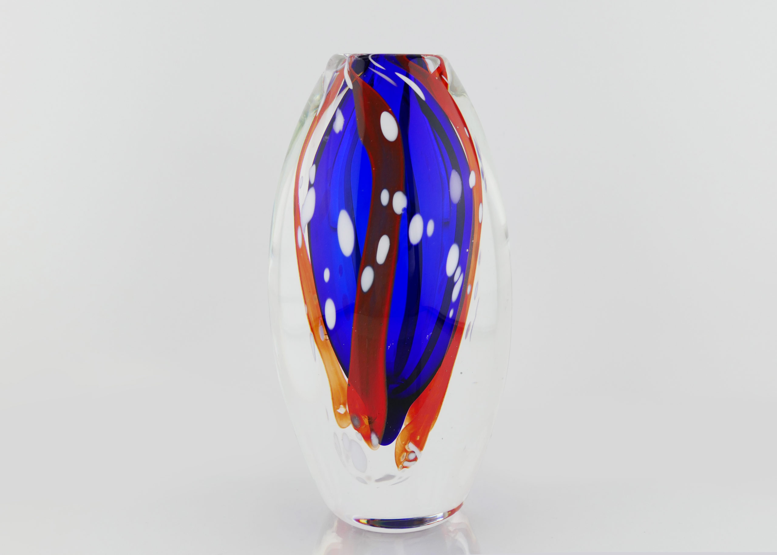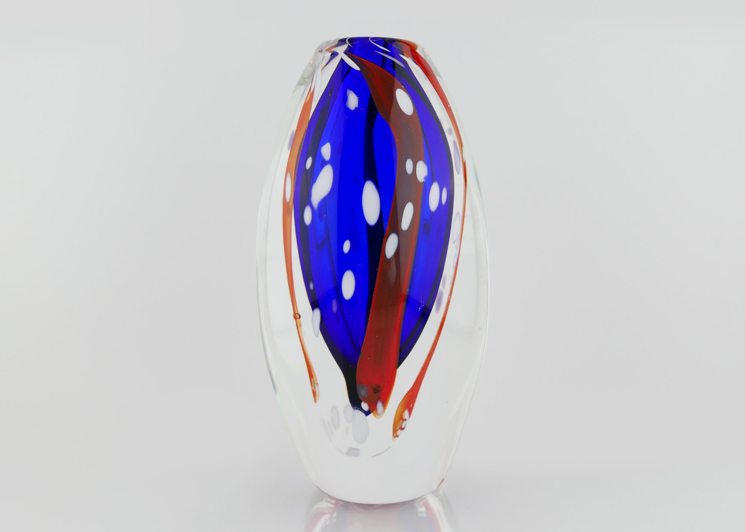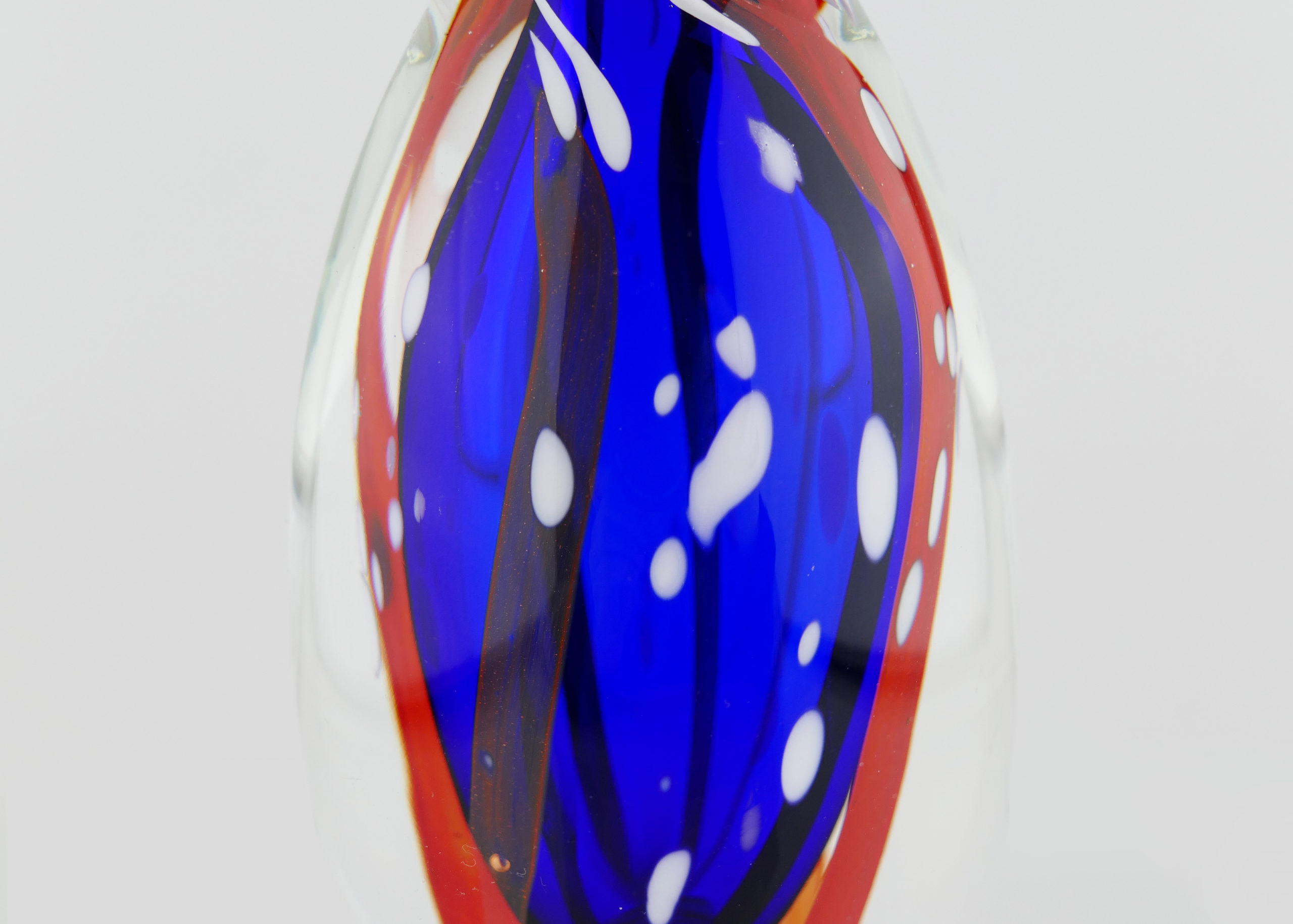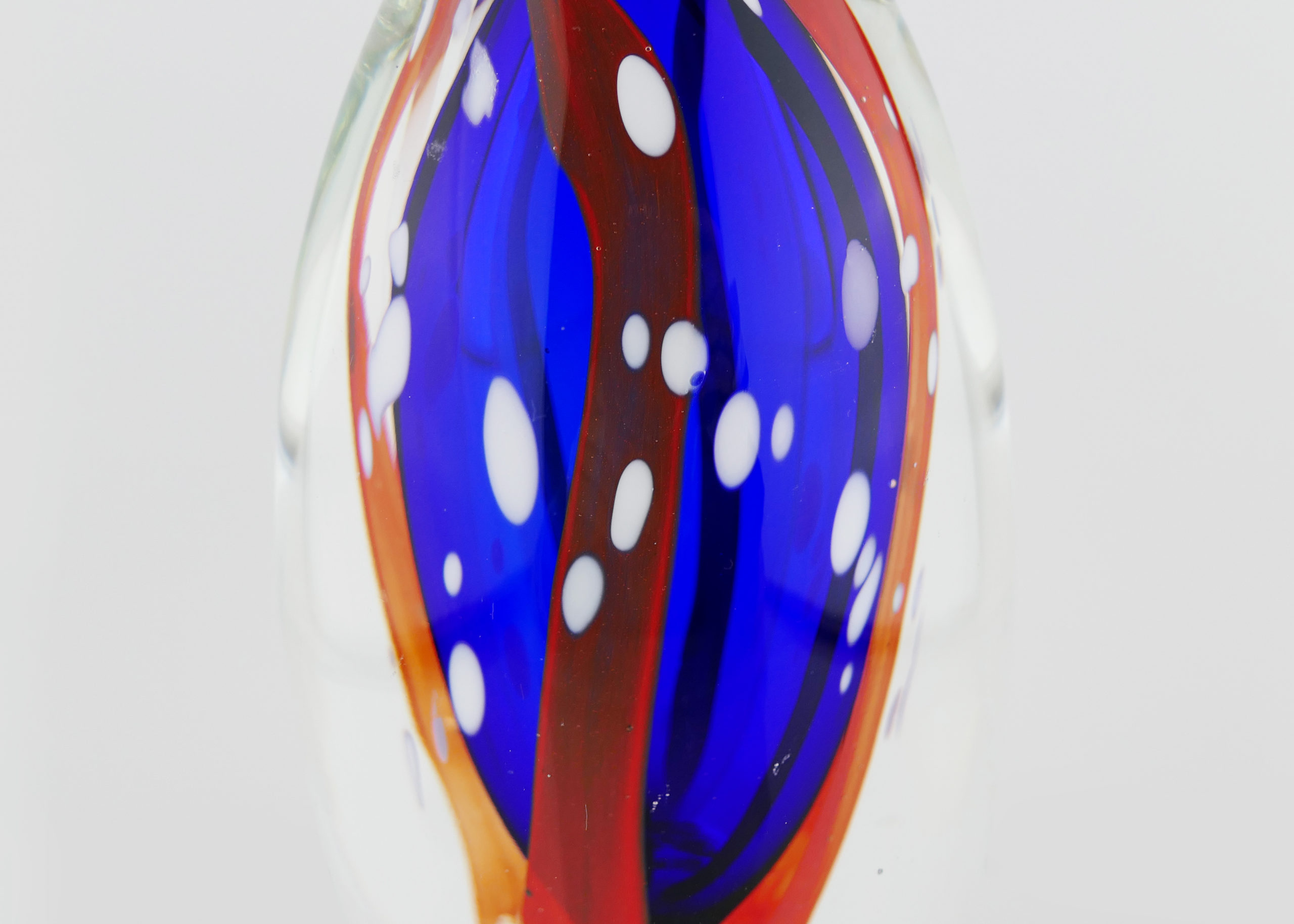 Pièce unique "Berlingo" en verre soufflé bouche, formée à main levée, décors Bleu Intense, Inclusions cordons Rouge, grains Blanc.