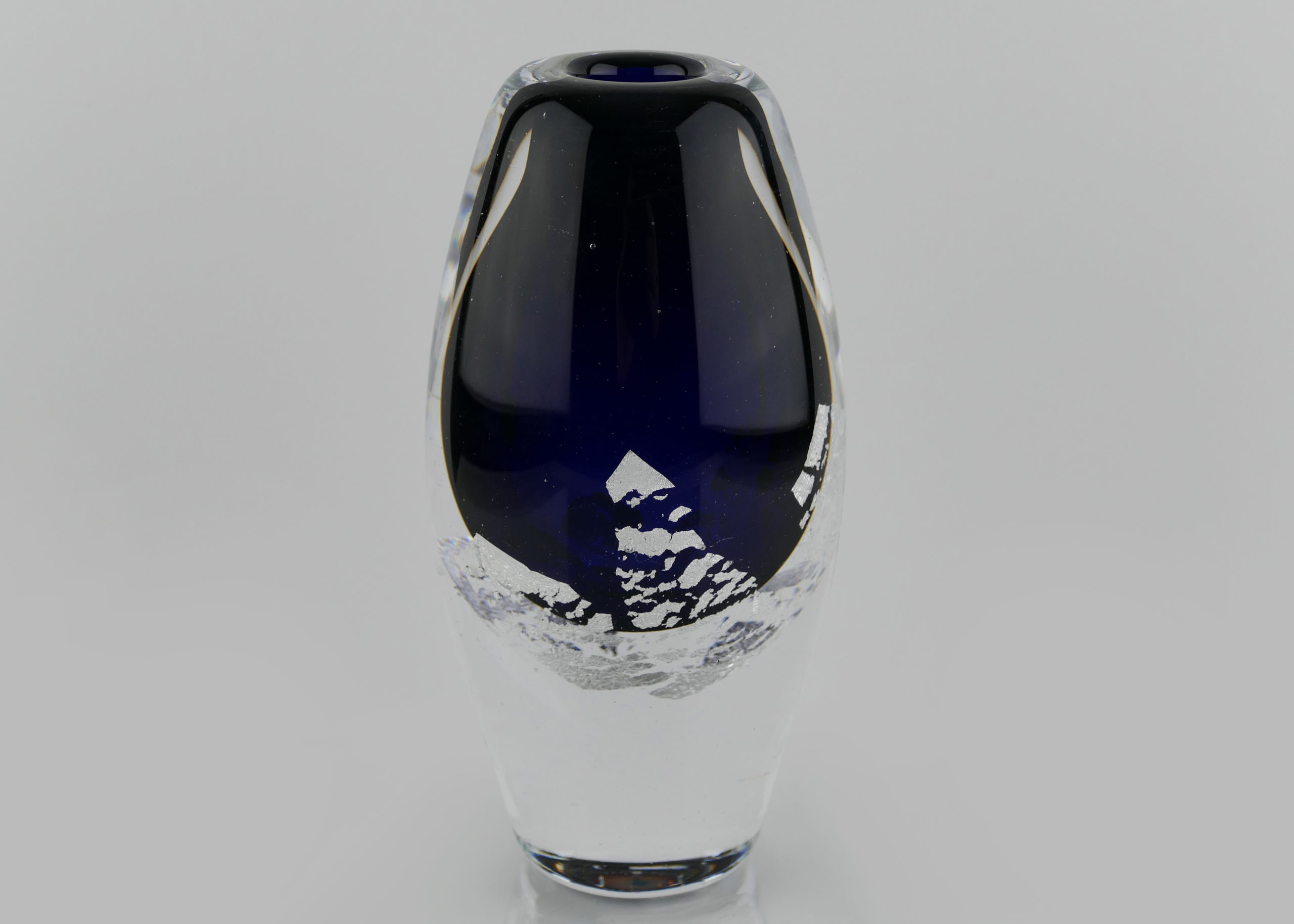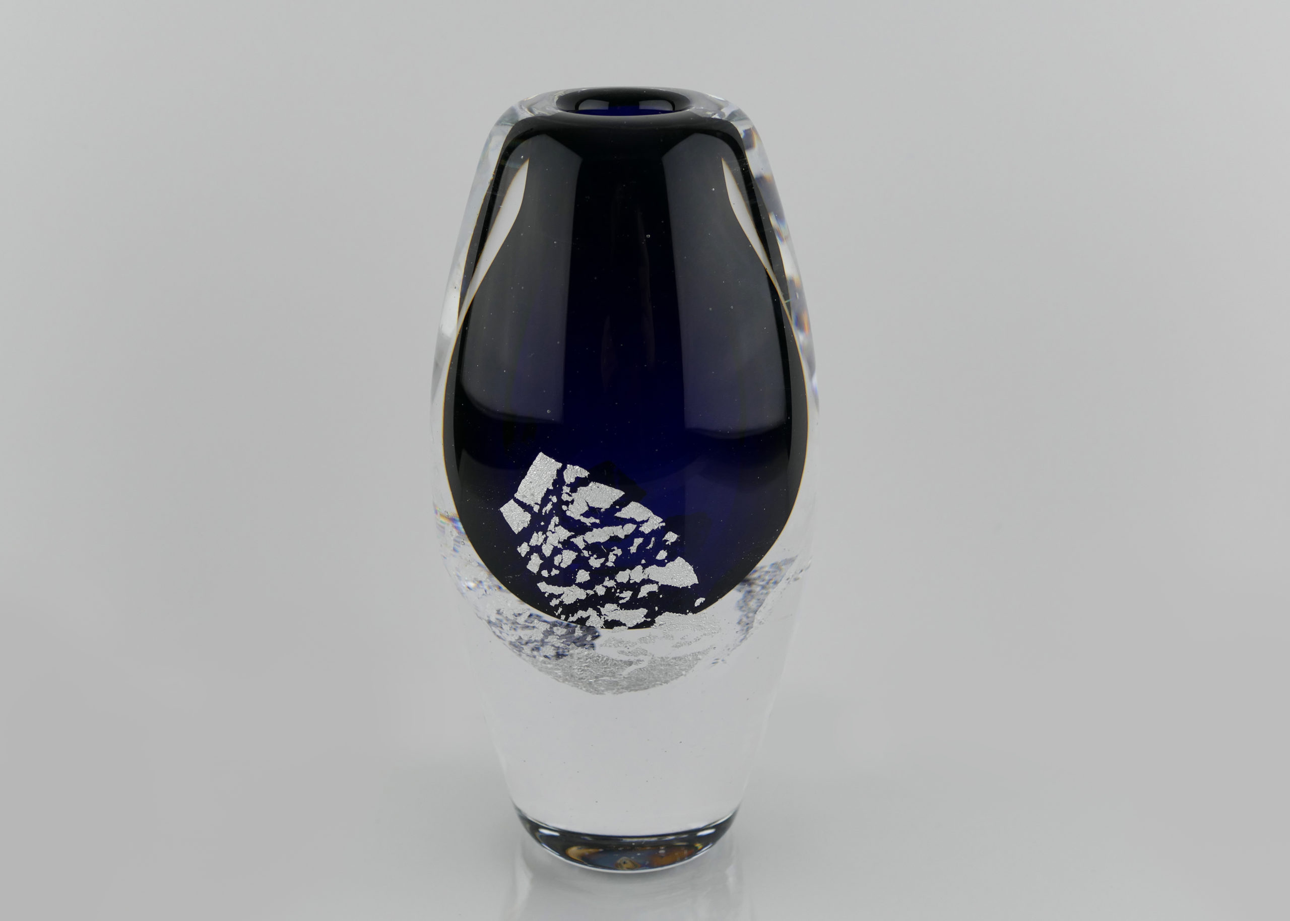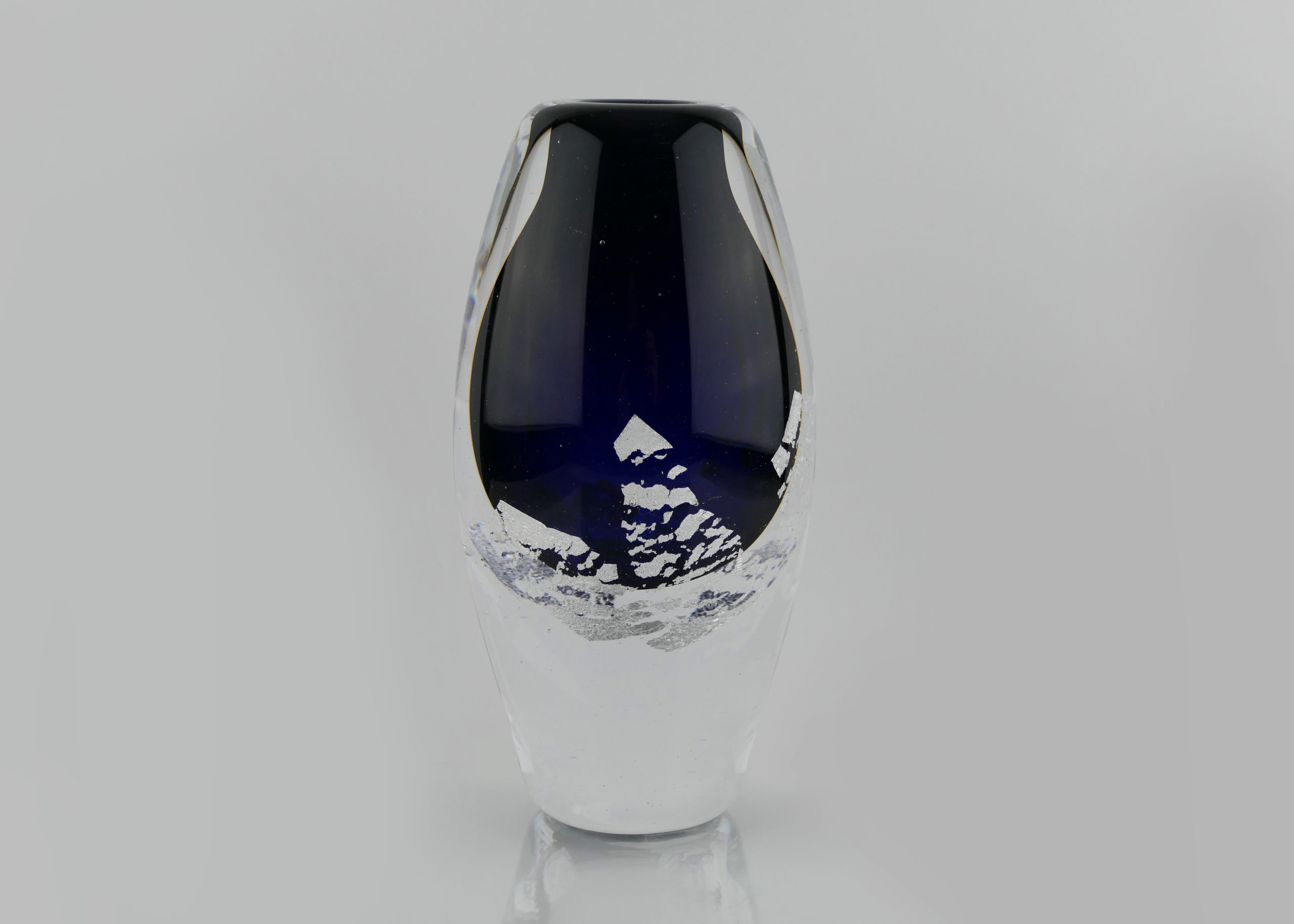 Berlingo Bleu Nuit, Soliflore en verre soufflé bouche, formé à main levée, Inclusion Feuille d’Argent