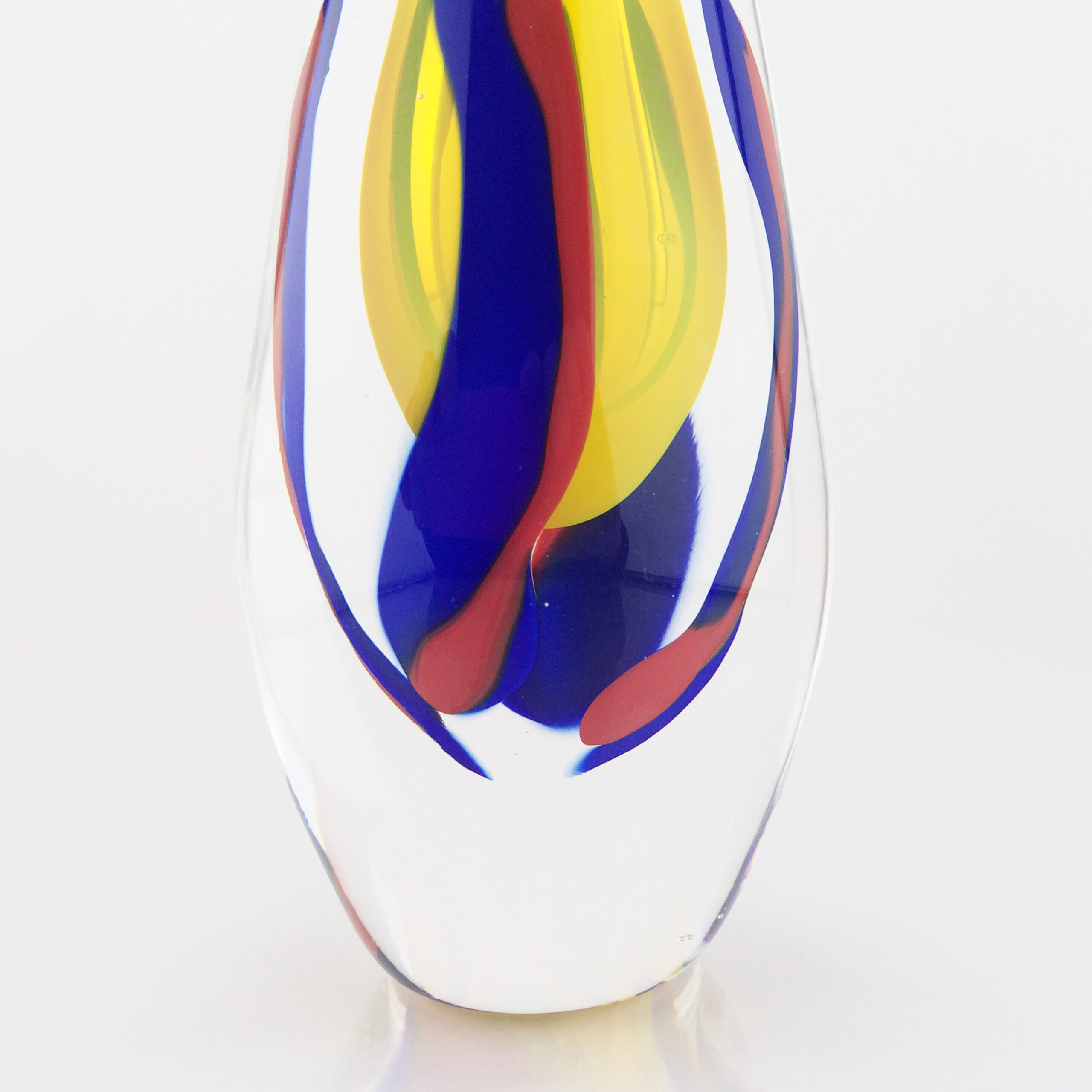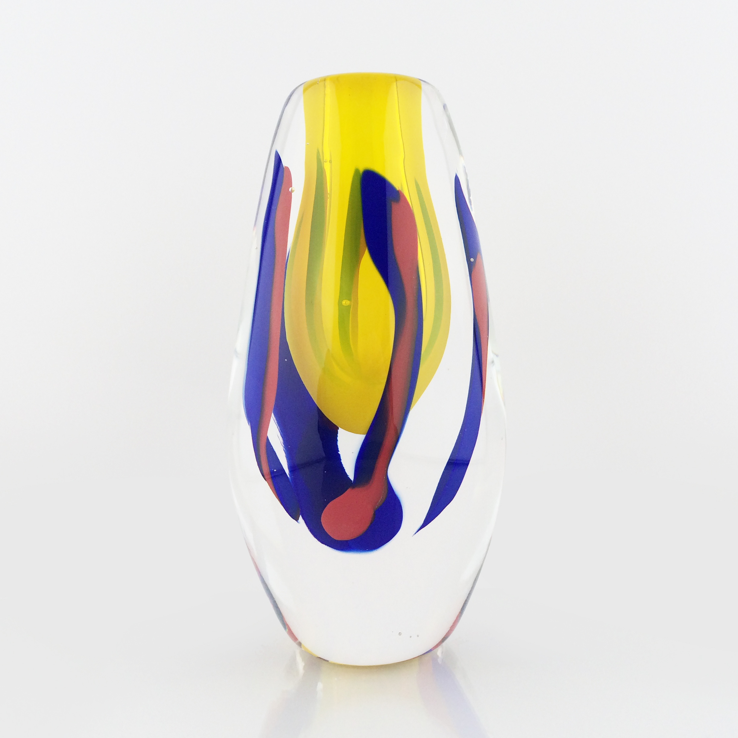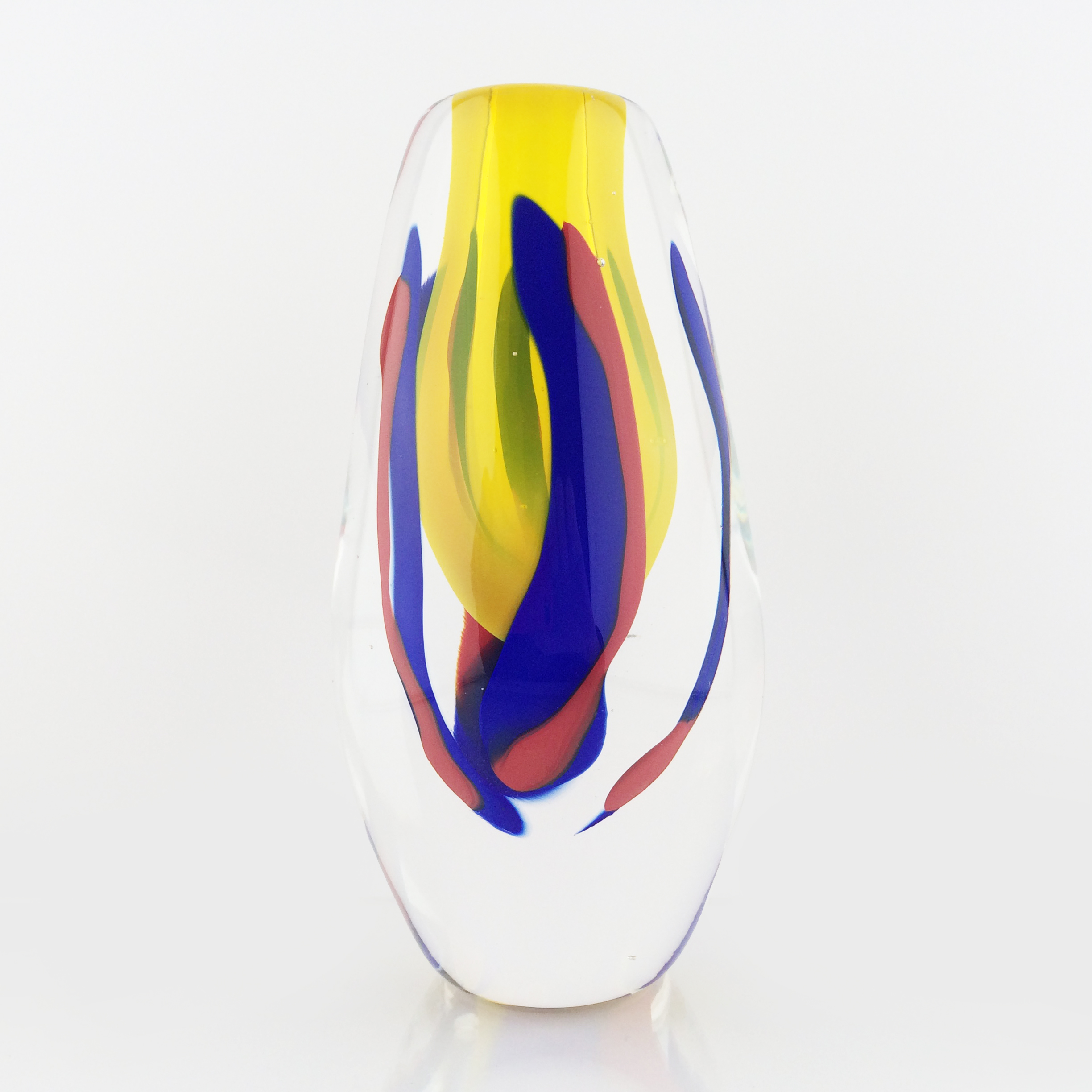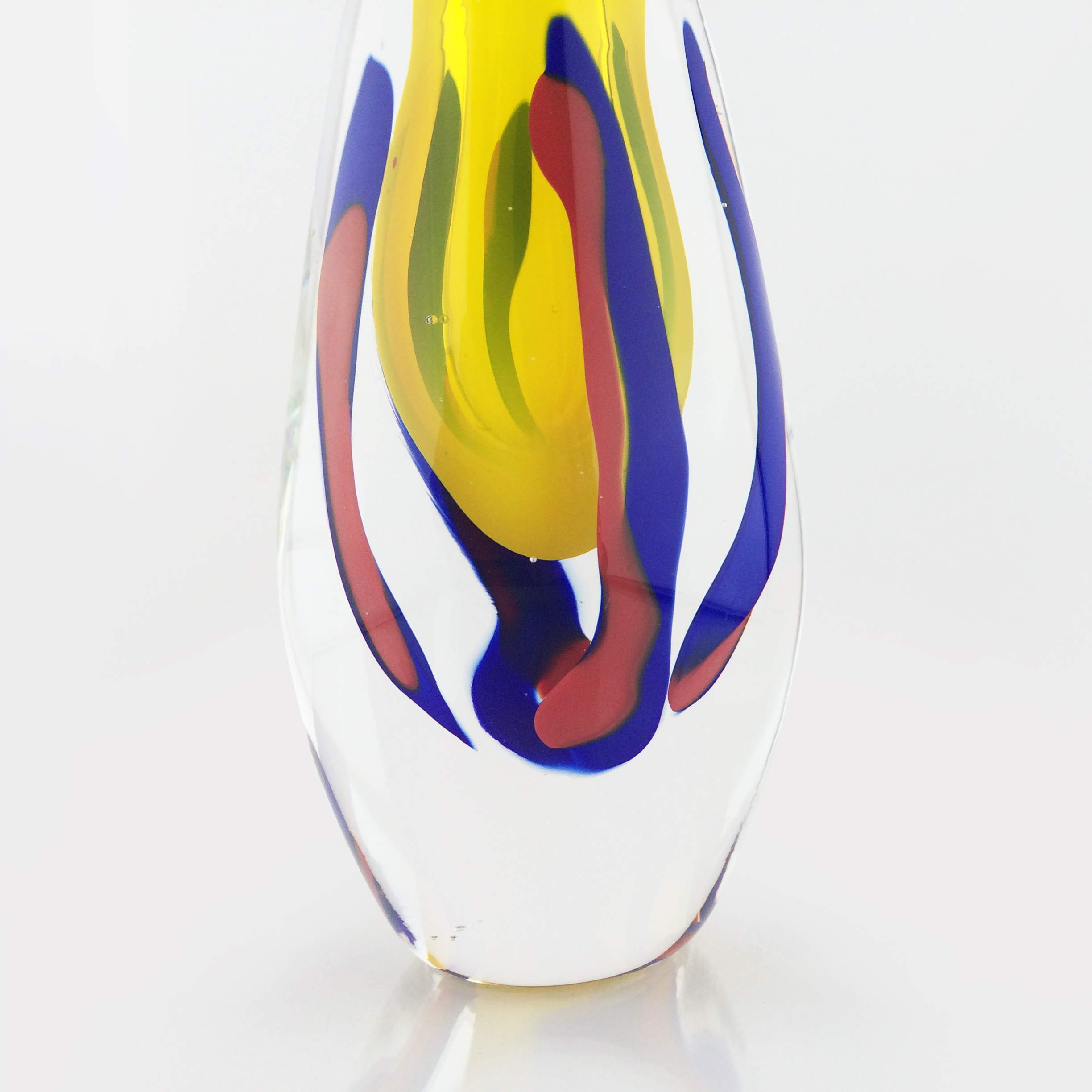 Berlingo Jaune Transparent, Soliflore en verre soufflé bouche, formé à main levée, Inclusions Bleu et Rouge