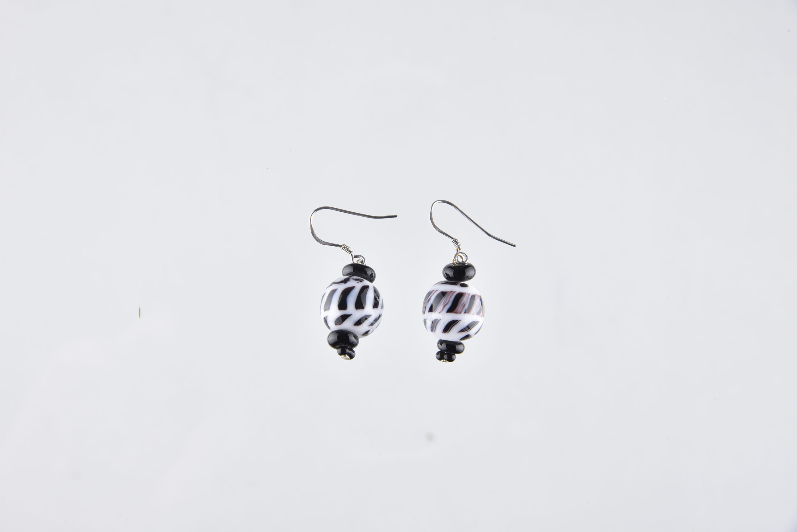 Boucles d’oreille perles rondes en Cristal de Murano Blanche décors spirale Blanche et Noire