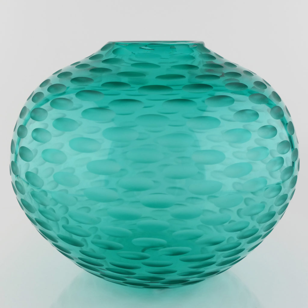 Translucide, Vase en verre soufflé bouche, formé à main levée de couleur Vert Lagon et Bleu. Effet écaille translucide satinée et aérien