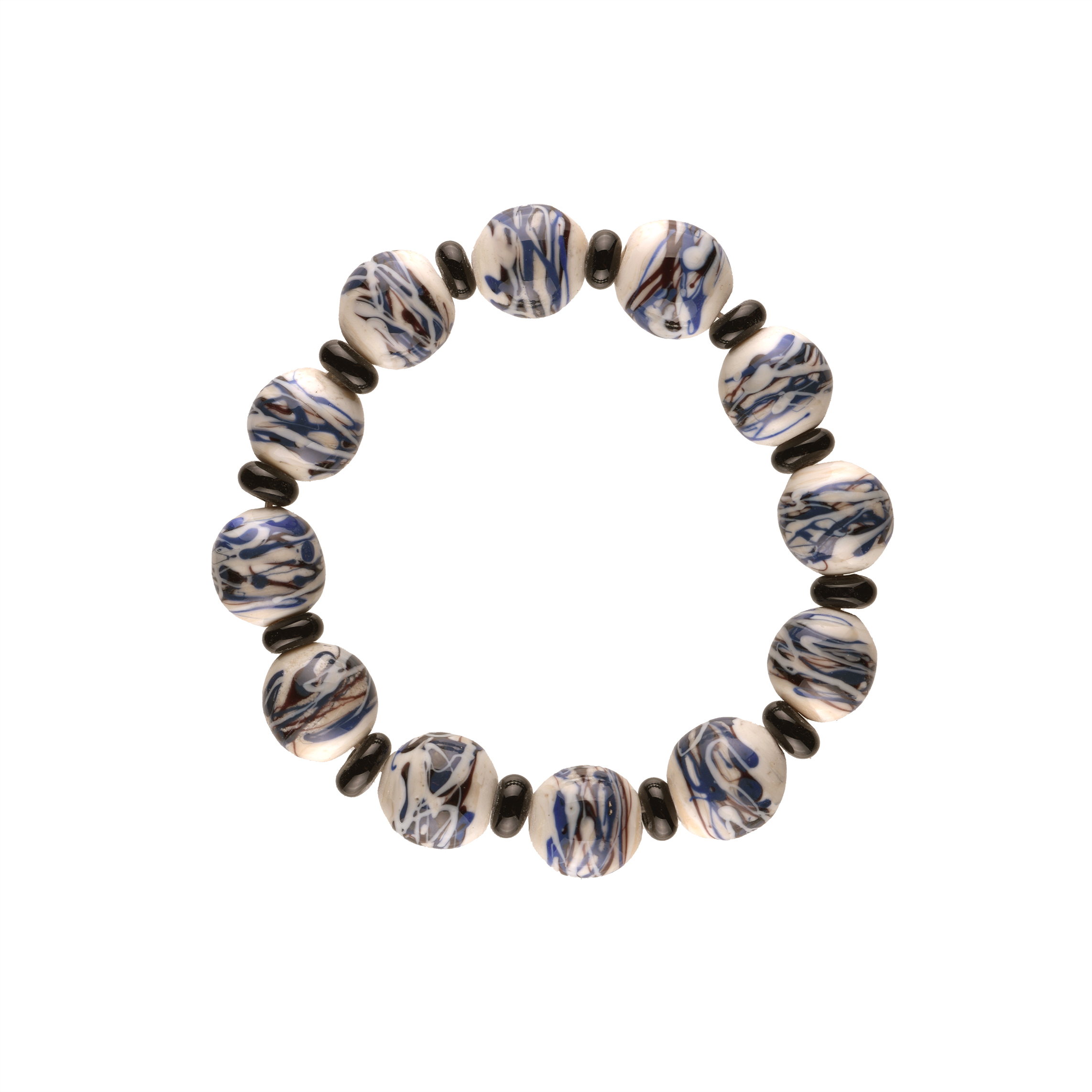 Bracelet perles en Cristal de Murano couleur Ivoire décors abstrait Noir et Bleu