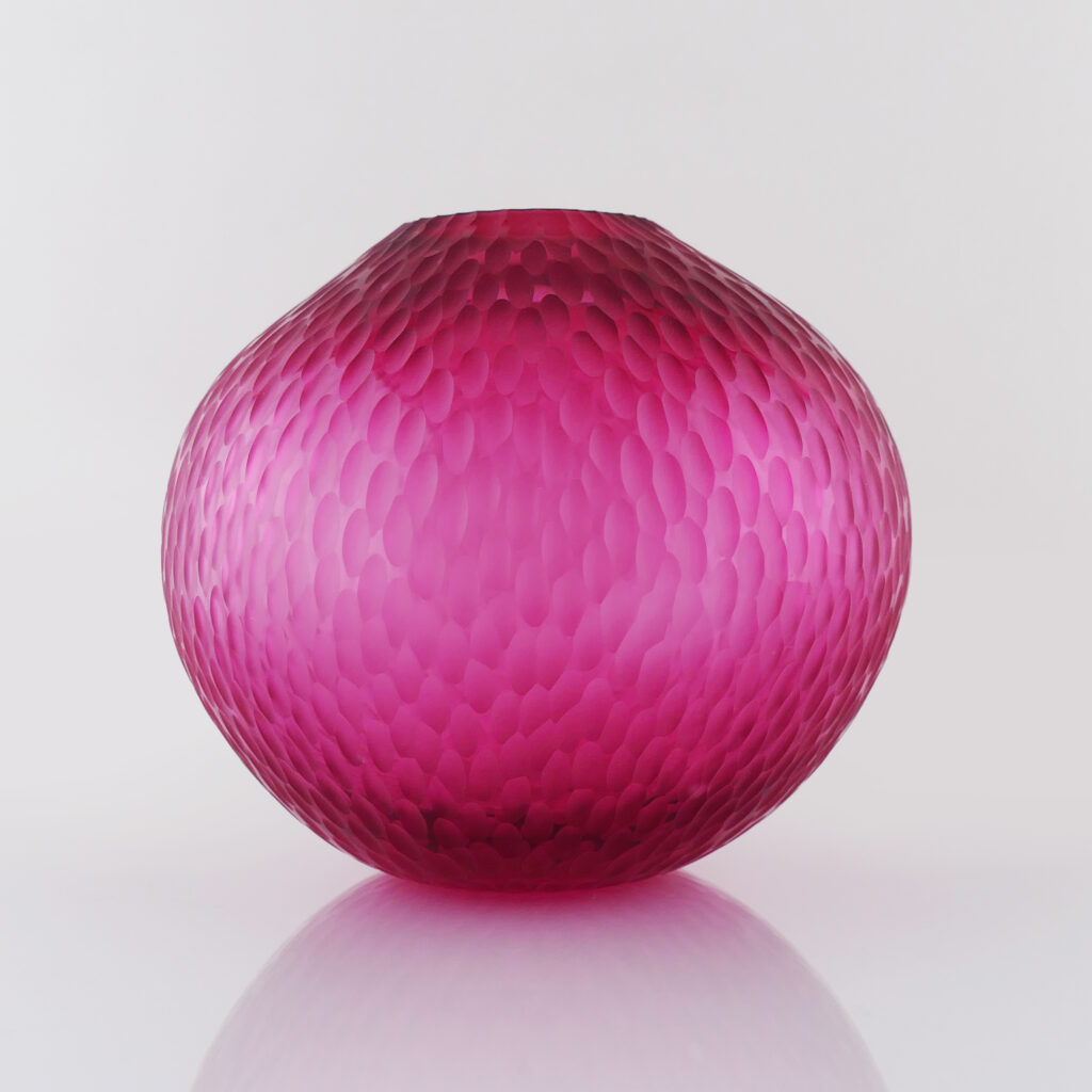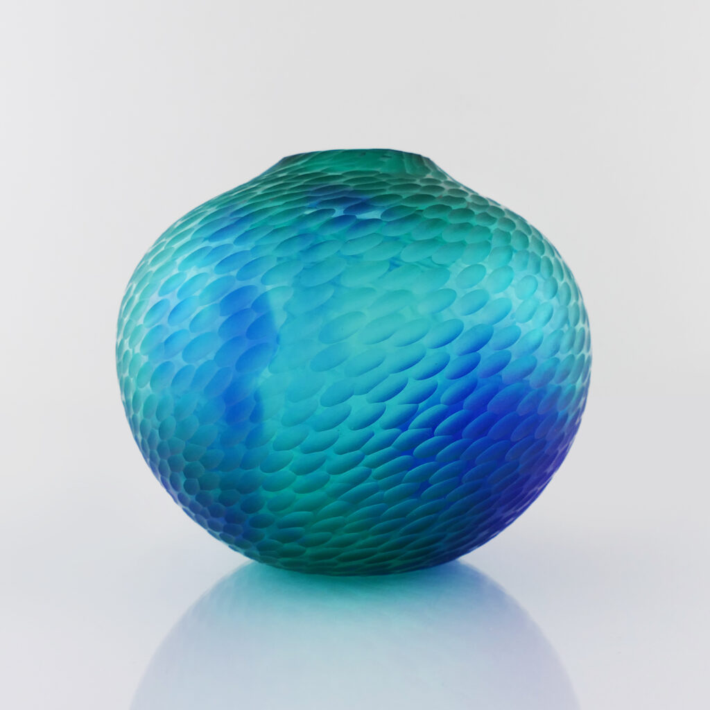 Puis par un long travail, j'obtient en taillant la surface du verre des motifs et décors sur mes support unis colorés dans la masse.