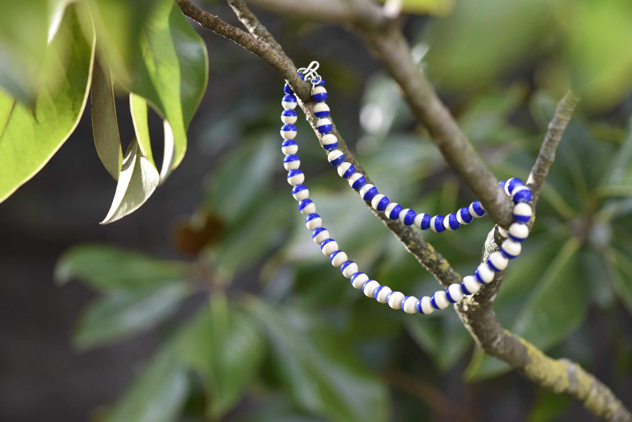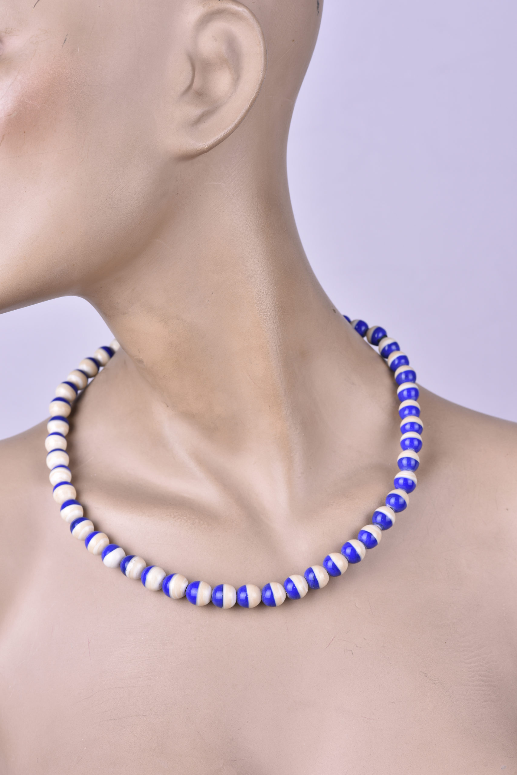 Collier perles rondes en Cristal de Murano couleur Ivoire décors abstrait Noir et Bleu
