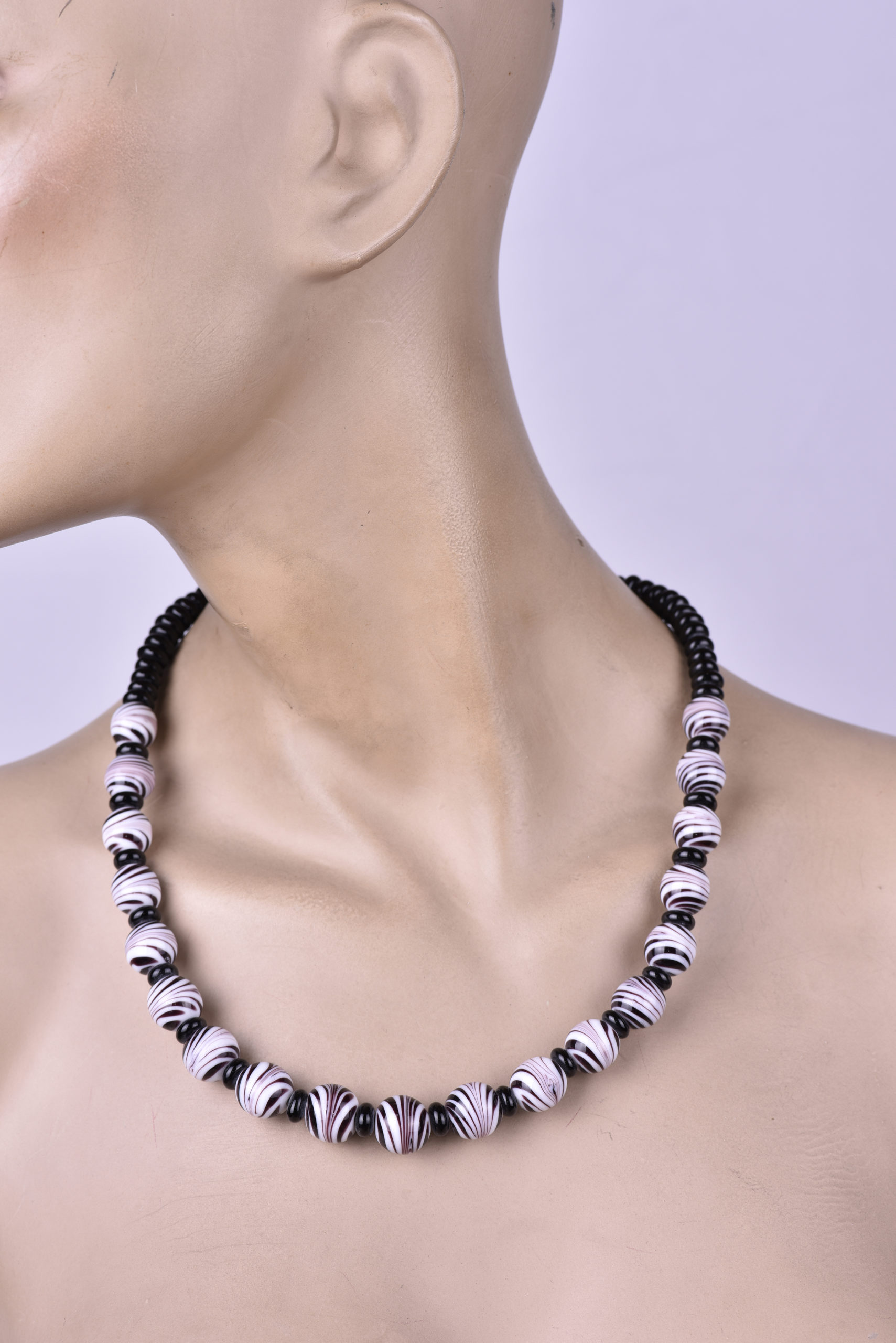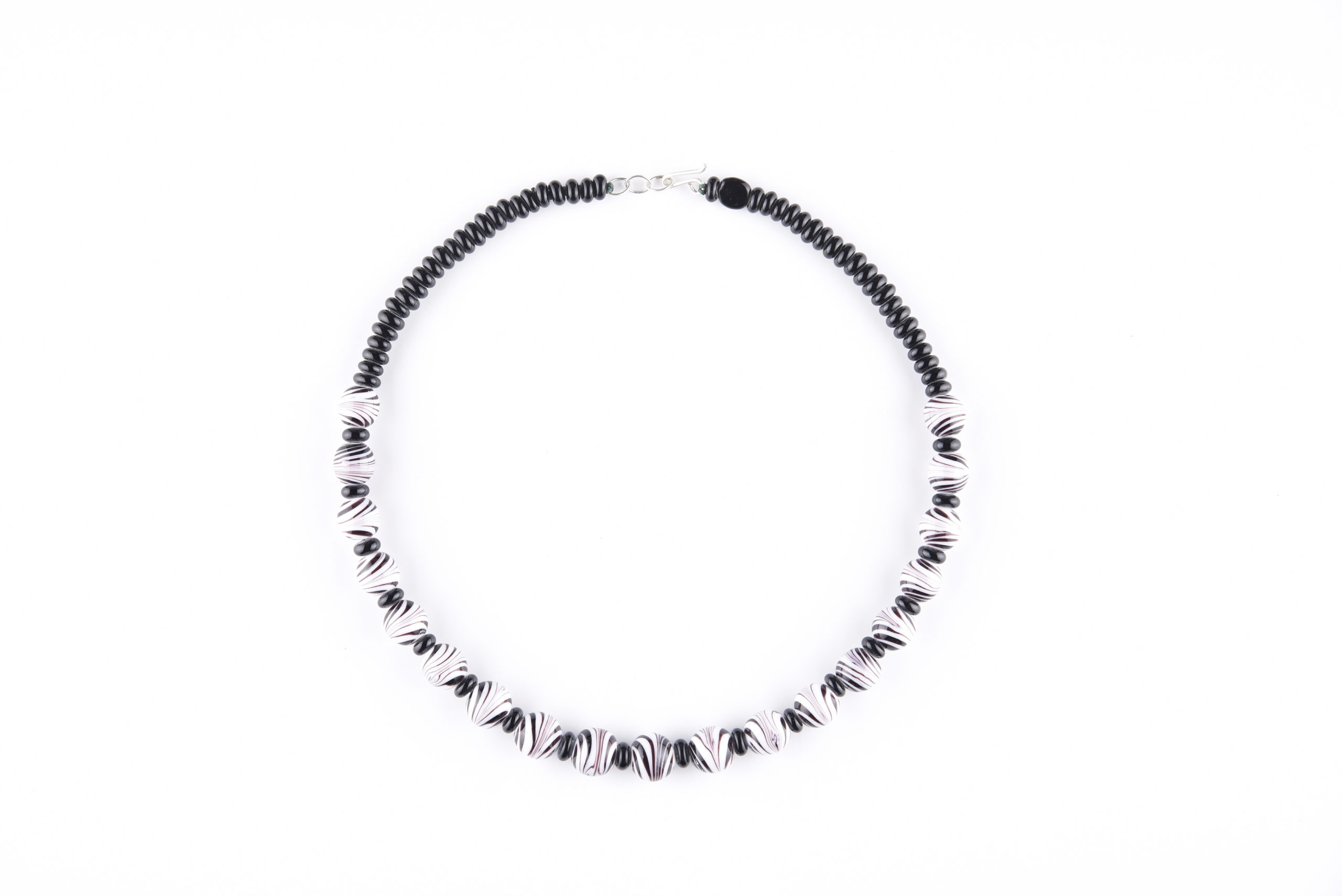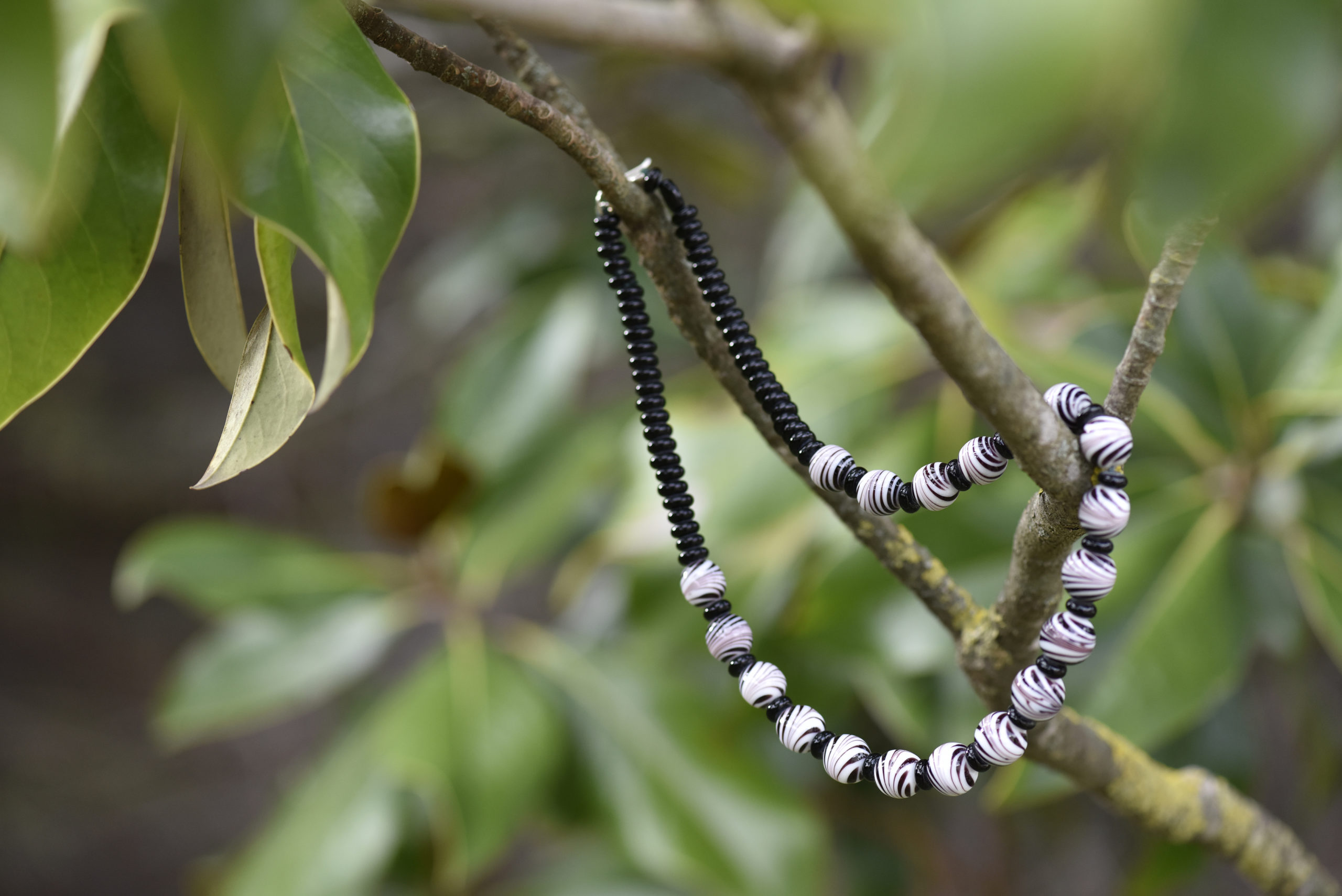Collier perles rondes en Cristal de Murano Noire décors peigné Blanc