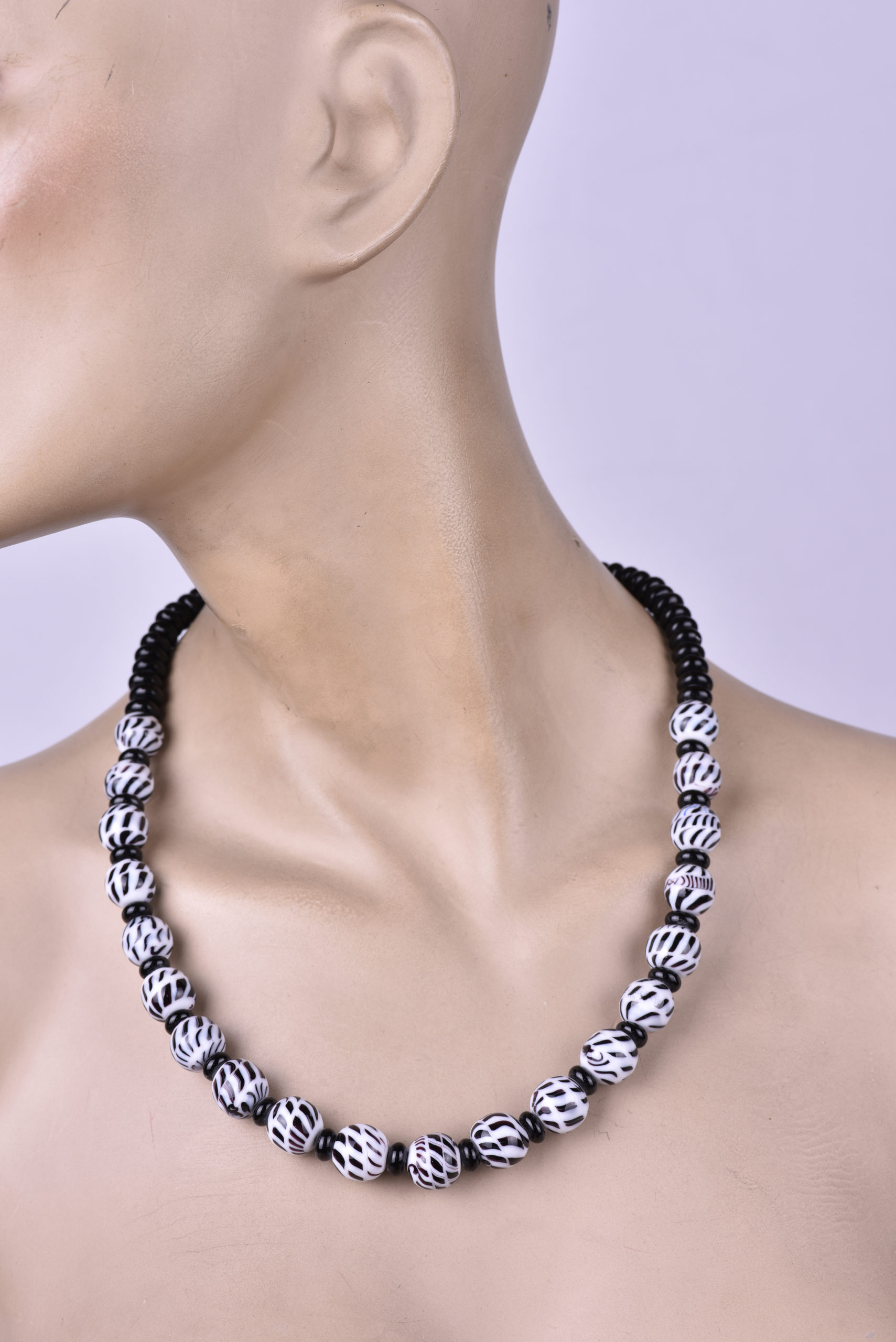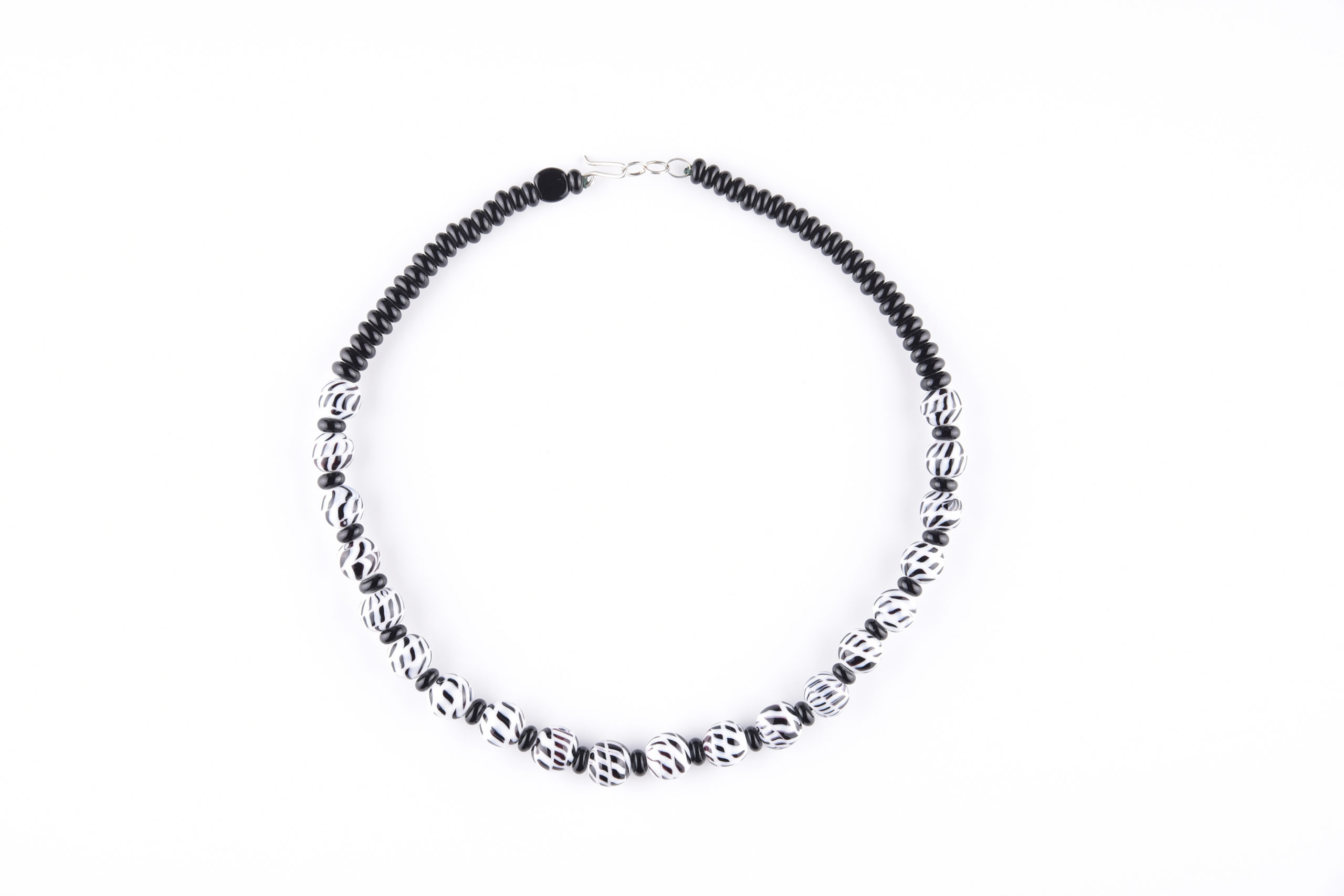 Collier perles rondes en Cristal de Murano Noire décors peigné Blanc