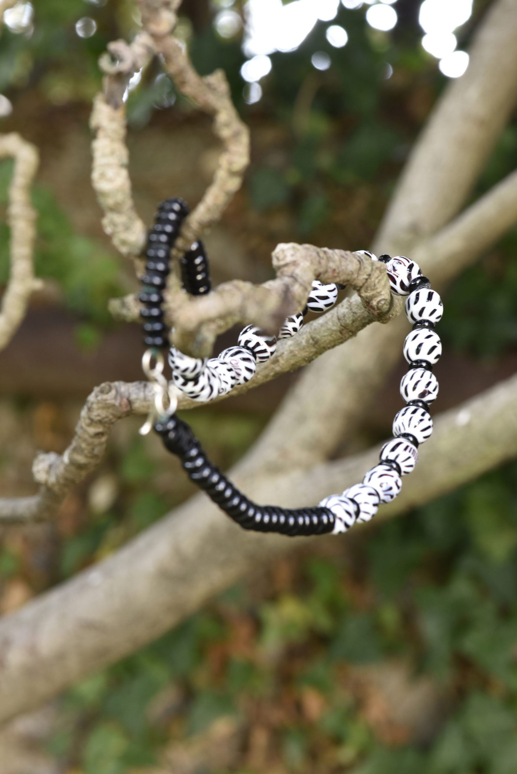 Bracelet perles rondes en Cristal de Murano Noir, Zébré Couleur Ivoire