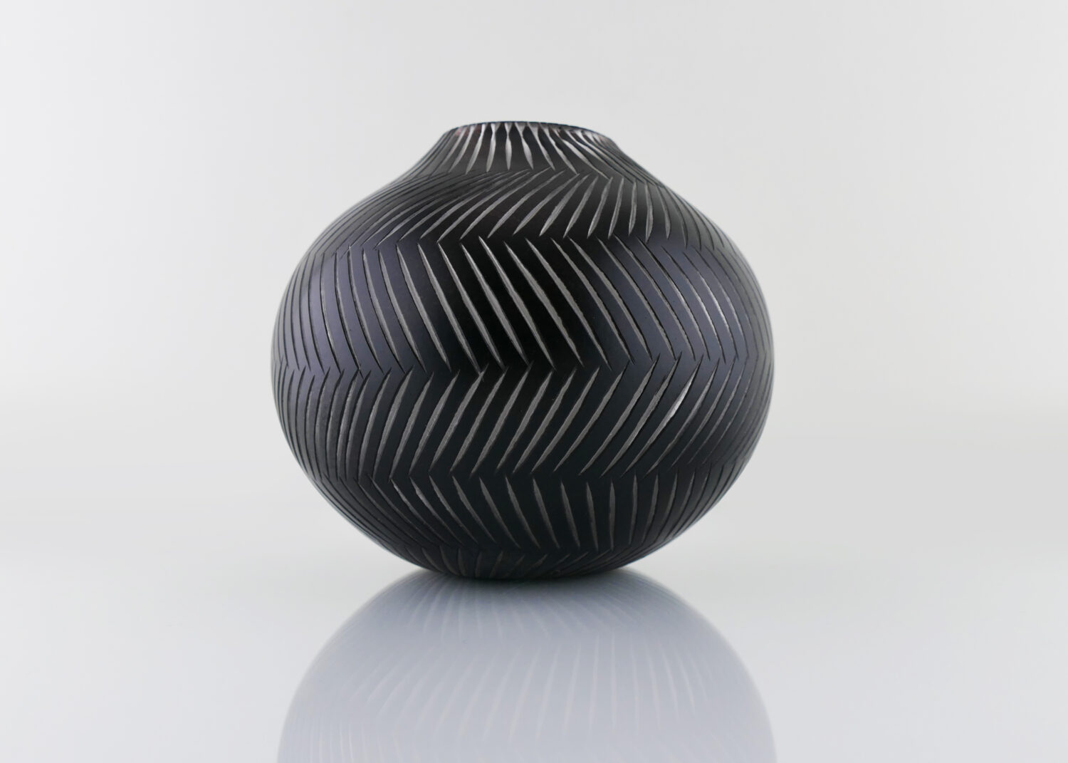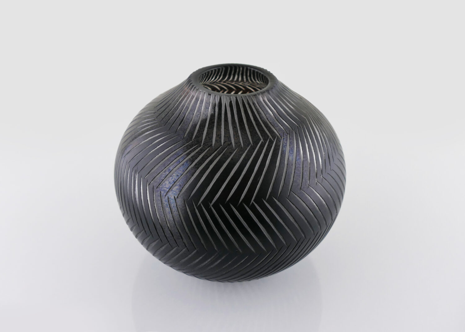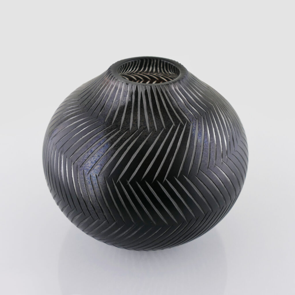 Vase "Africa" en verre soufflé à la bouche, façonné à main levée dans une composition multicouche d'émail noir. La surface présente un travail de sculpture au diamant en motif quinconce, créant des jeux de lumière subtils entre les finitions mâtes et satinées.