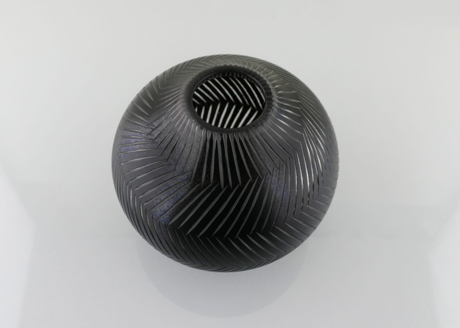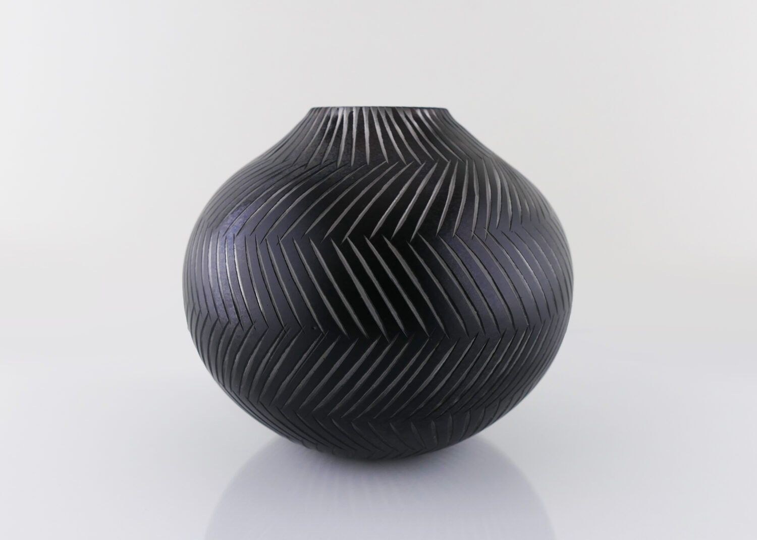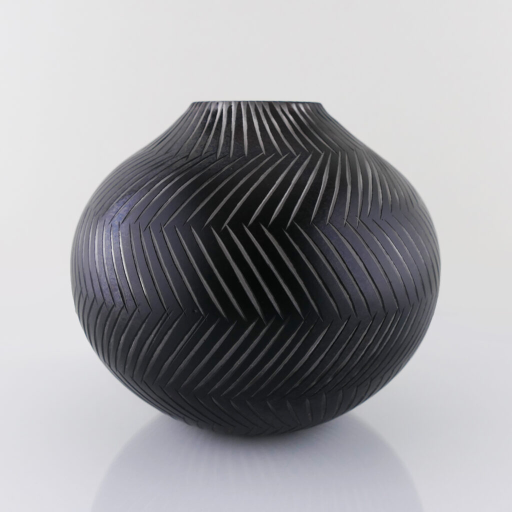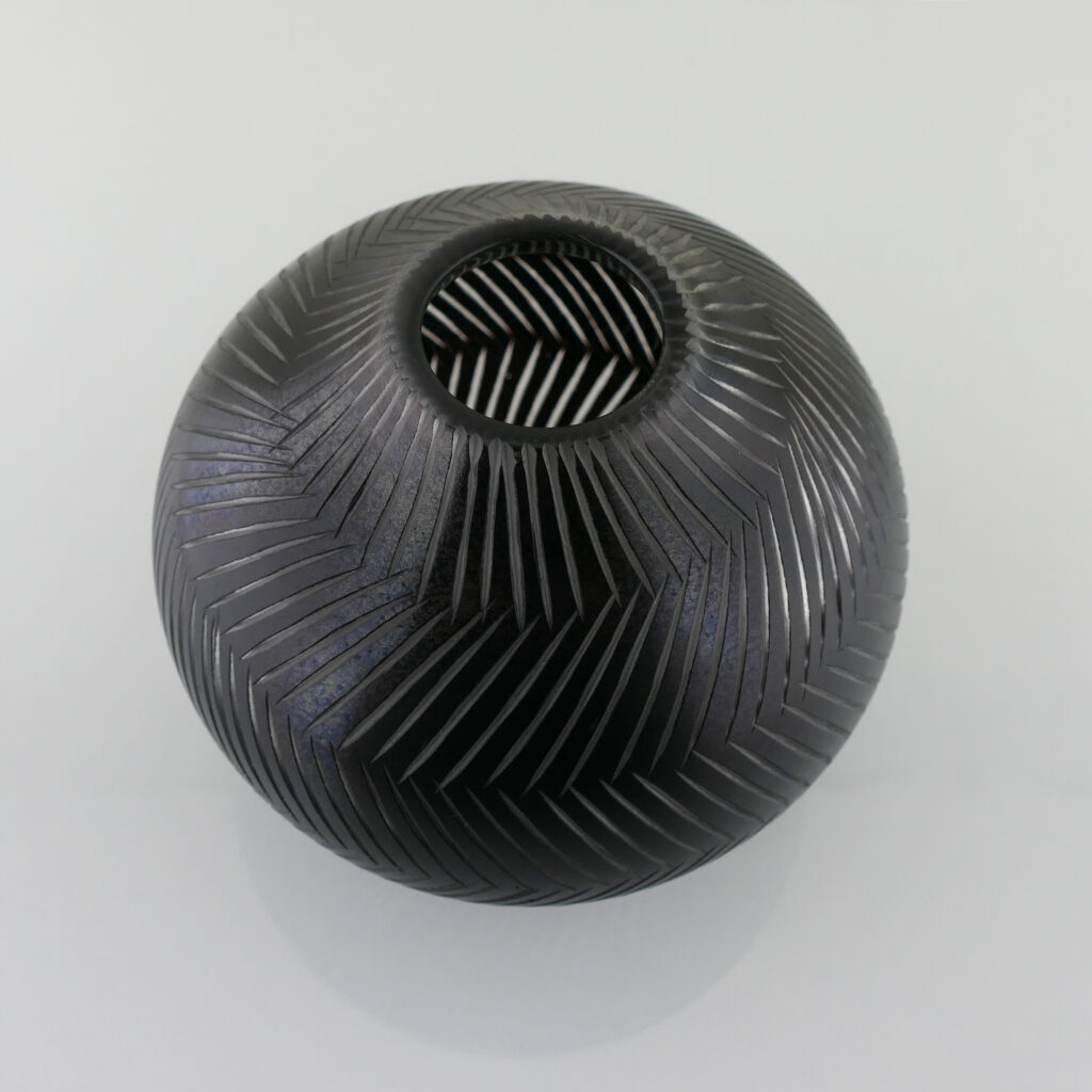 Vase "Africa" en verre soufflé à la bouche, façonné à main levée dans une composition multicouche d'émail noir. La surface présente un travail de sculpture au diamant en motif quinconce, créant des jeux de lumière subtils entre les finitions mâtes et satinées.