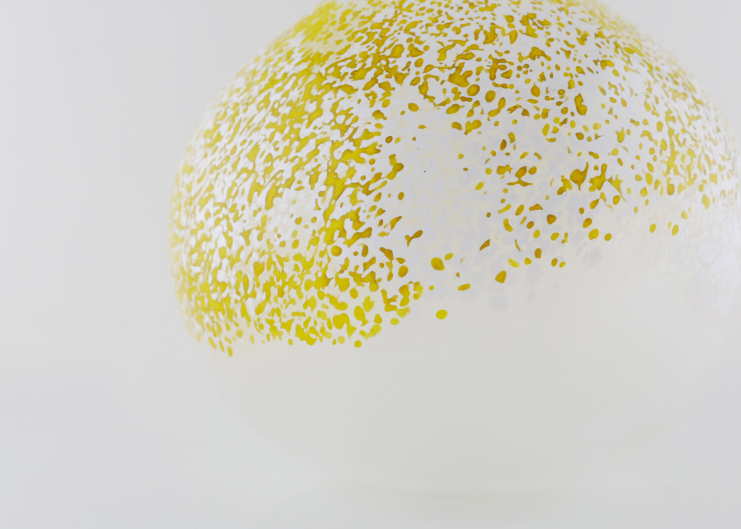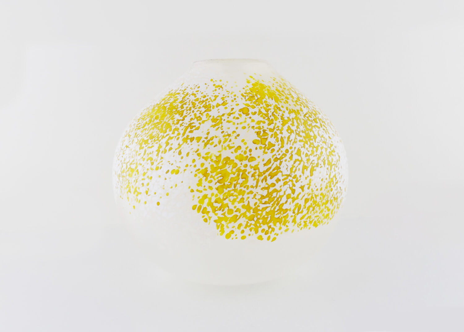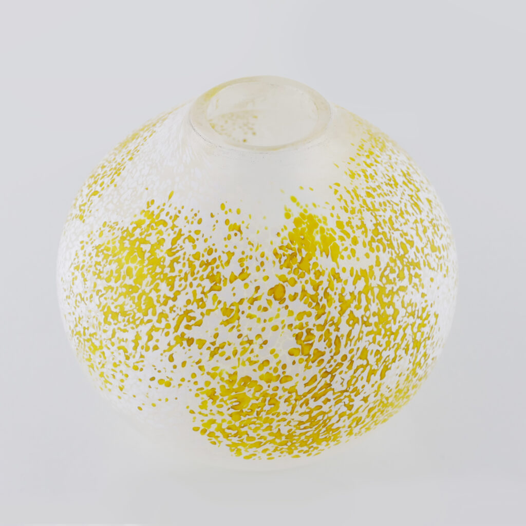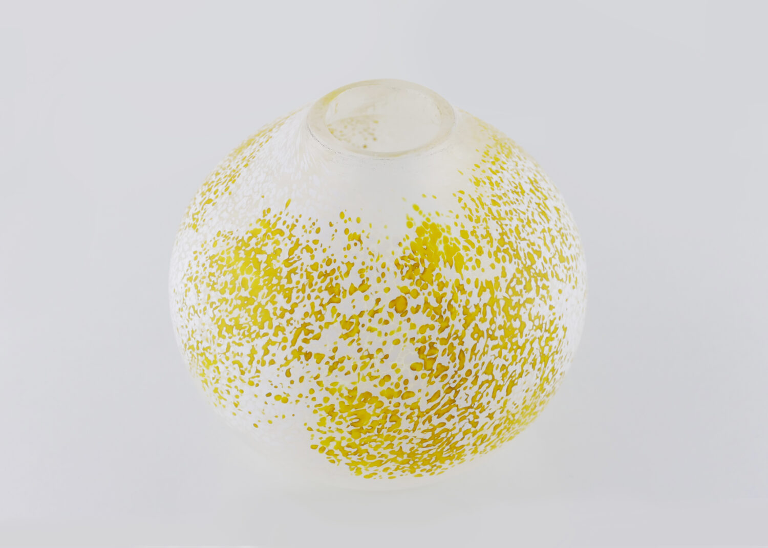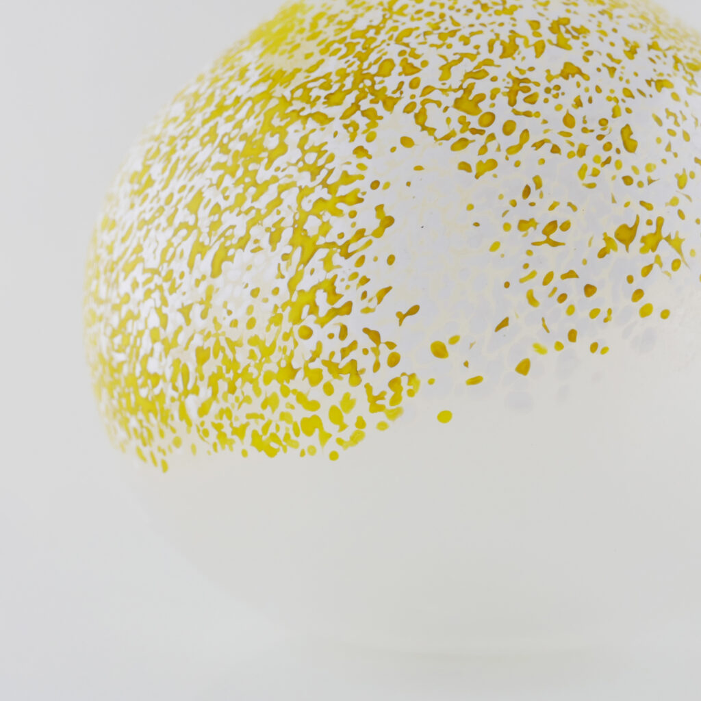 Cette pièce unique "Mimosa" soufflé bouche, façonnée à main levée révèle une palette chromatique subtile : albâtre dominant parsemé de touches blanc et jaune évoquant les délicates fleurs de mimosa. La surface translucide aux finitions satinées joue avec la lumière.