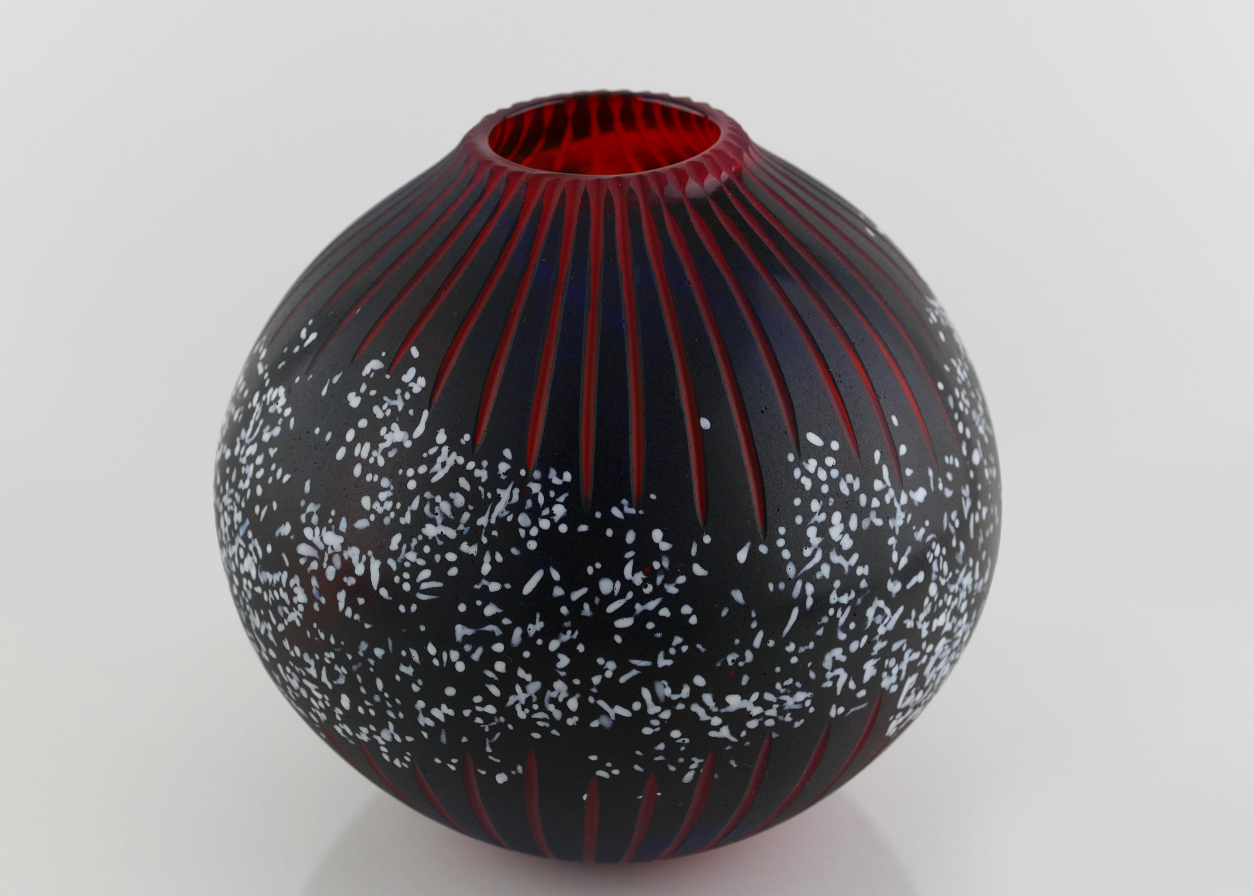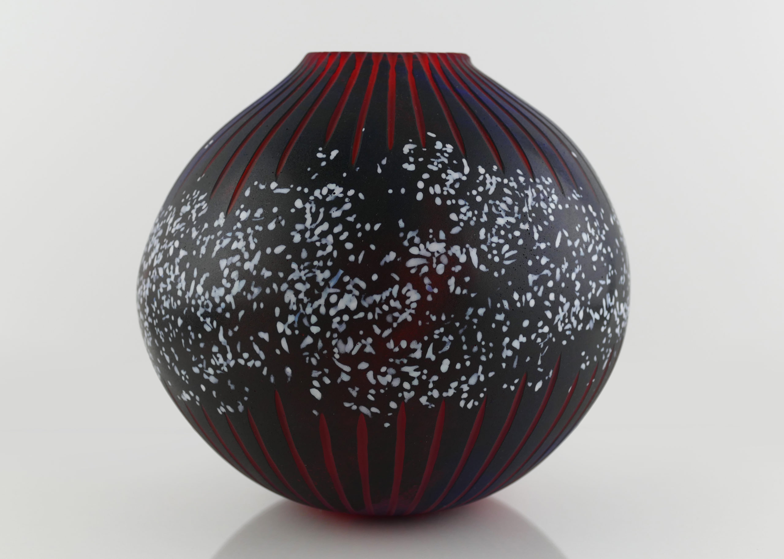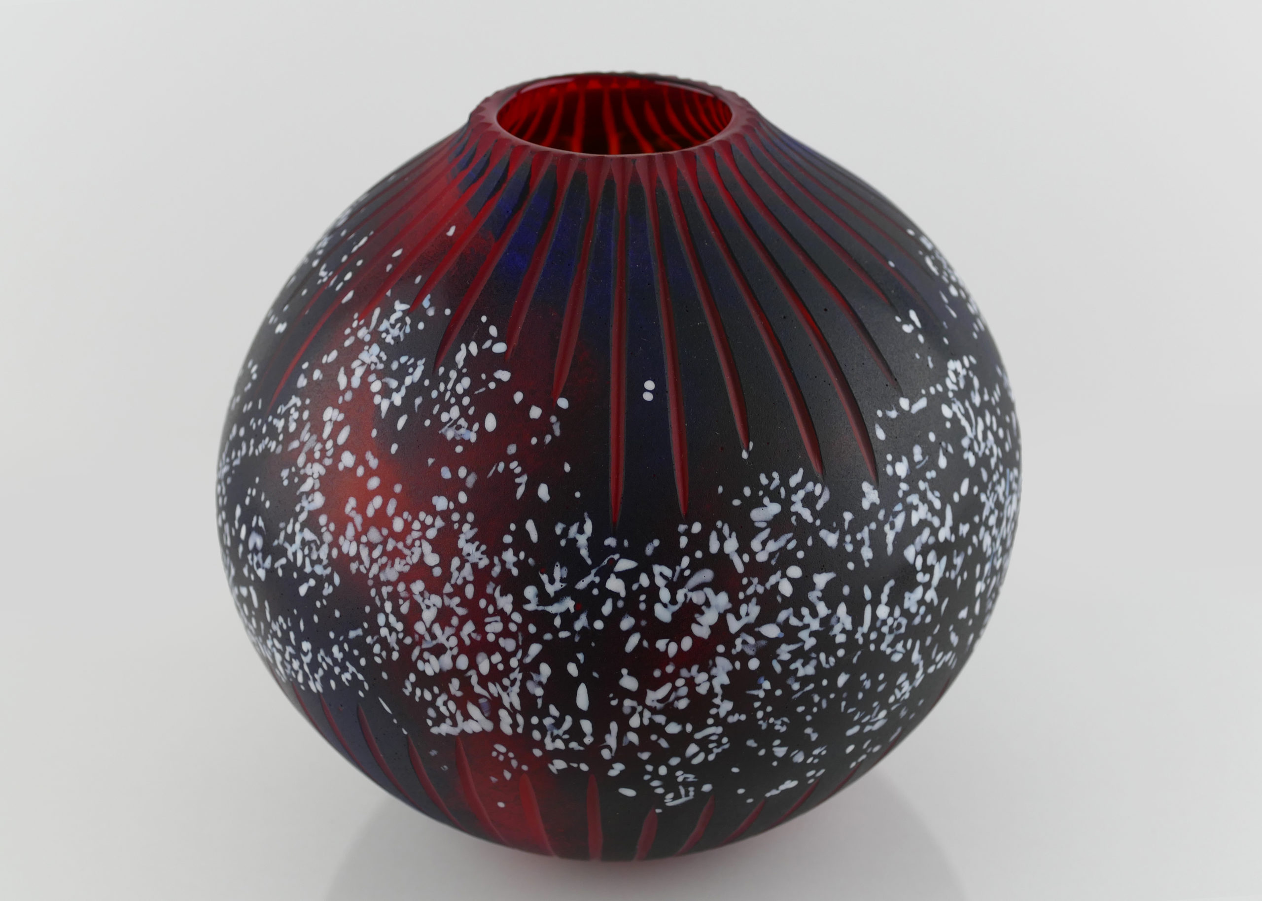 Pièce unique "Galaxie" en verre soufflé bouche, formée à main levée, décors de couleurs Rouge et Blanc, moucheté Vert et Rouge. Sculptée dans la masse au diamant, Sablage.