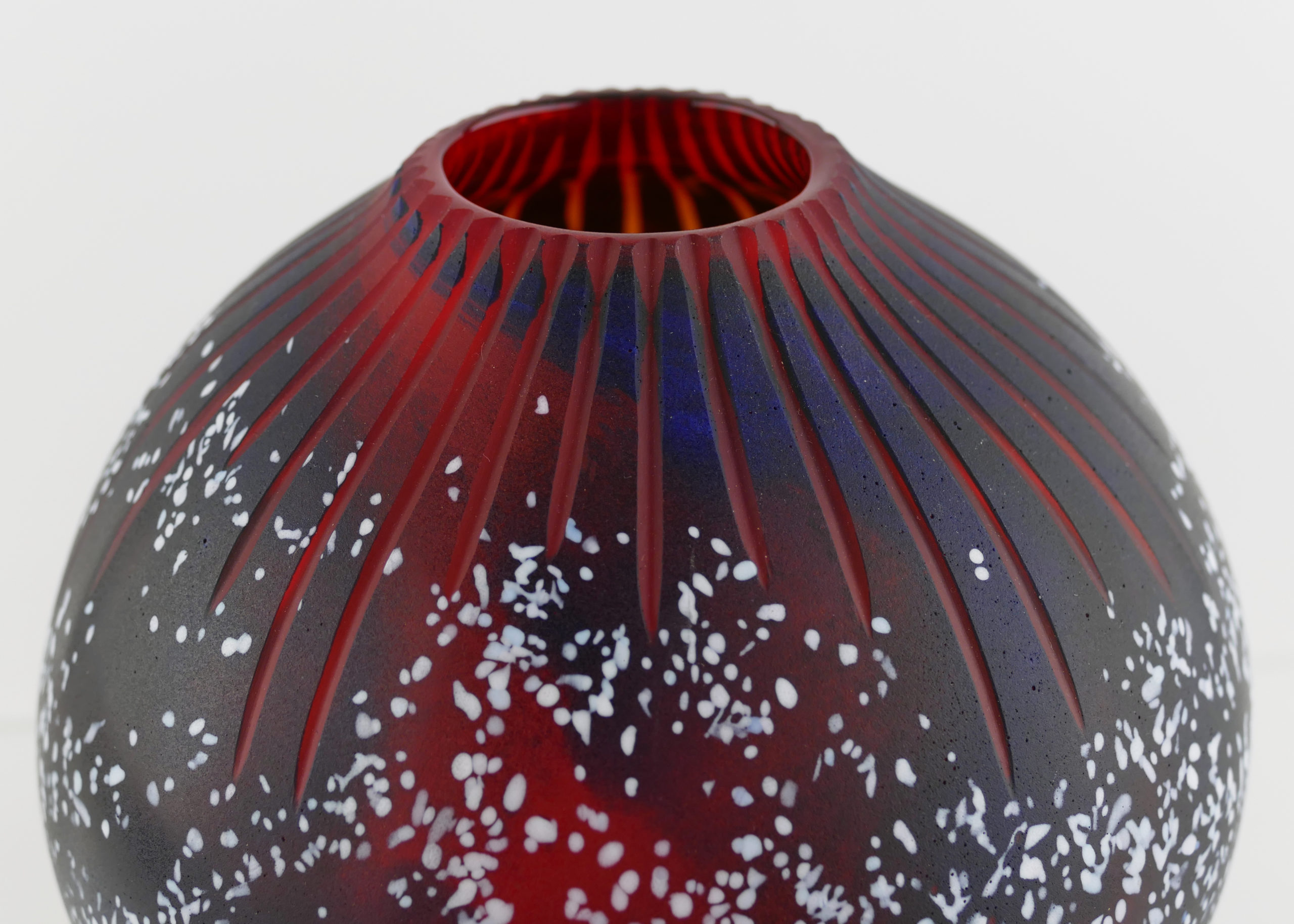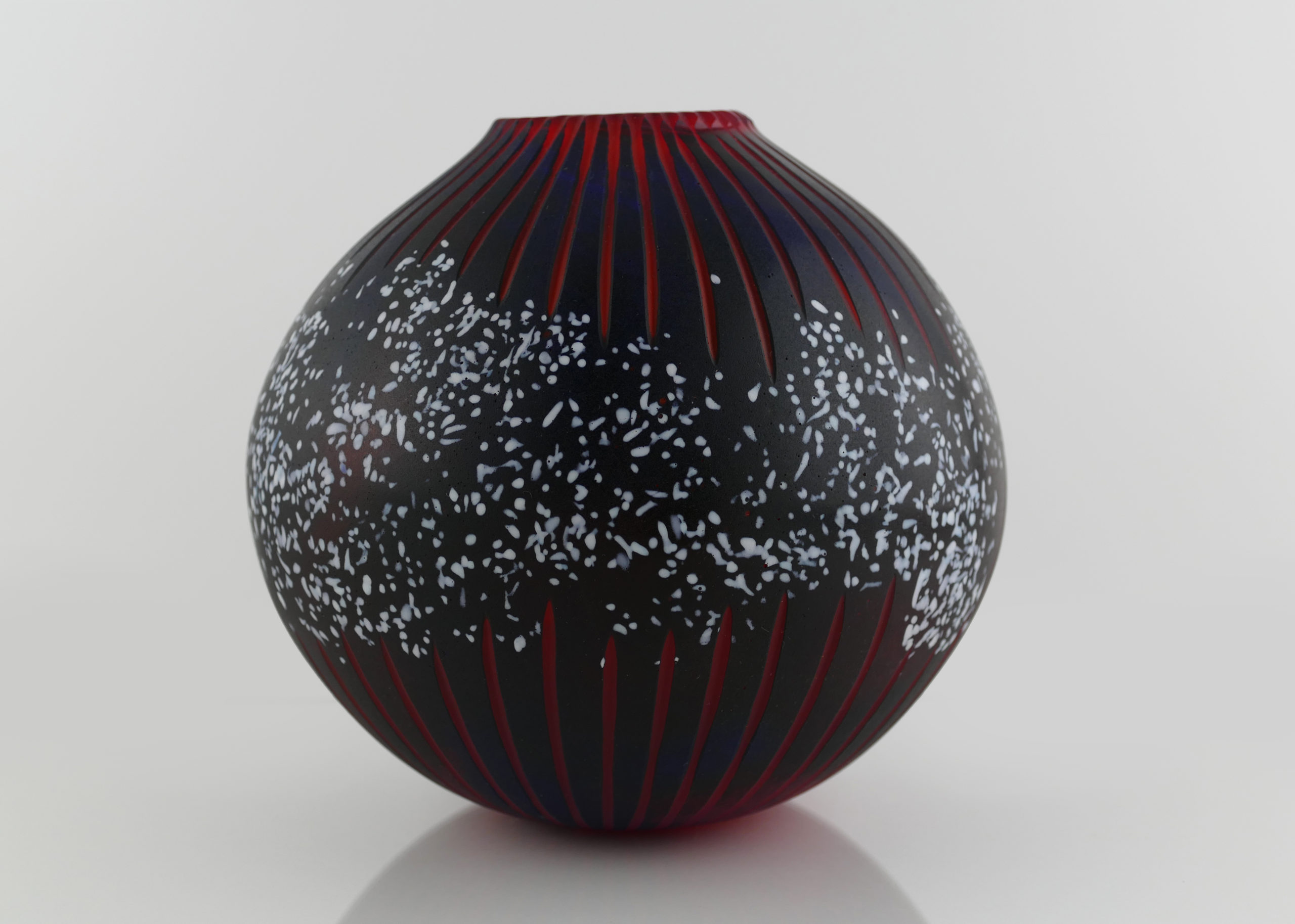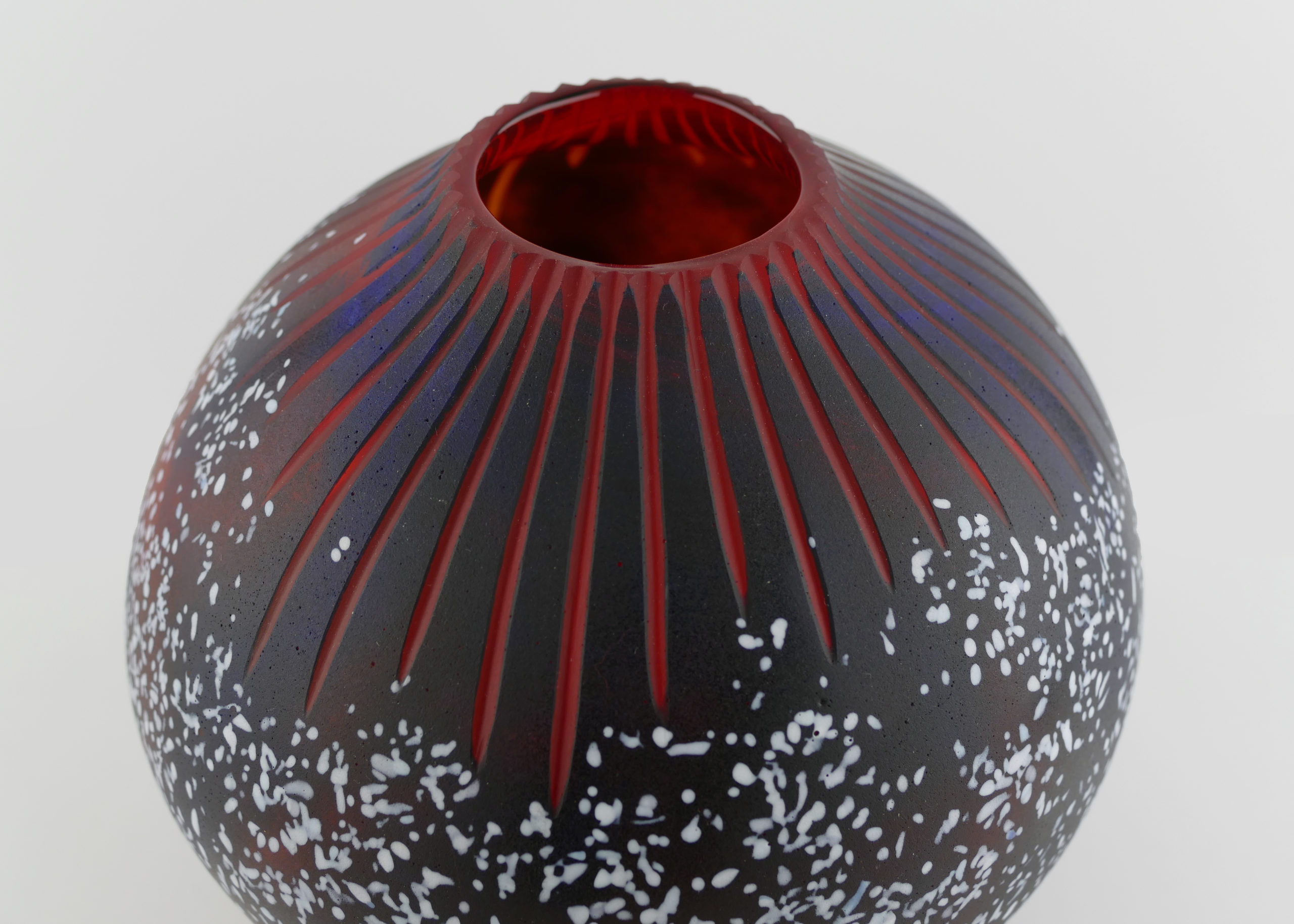 Pièce unique "Galaxie" en verre soufflé bouche, formée à main levée, décors de couleurs Rouge et Blanc, moucheté Vert et Rouge. Sculptée dans la masse au diamant, Sablage.