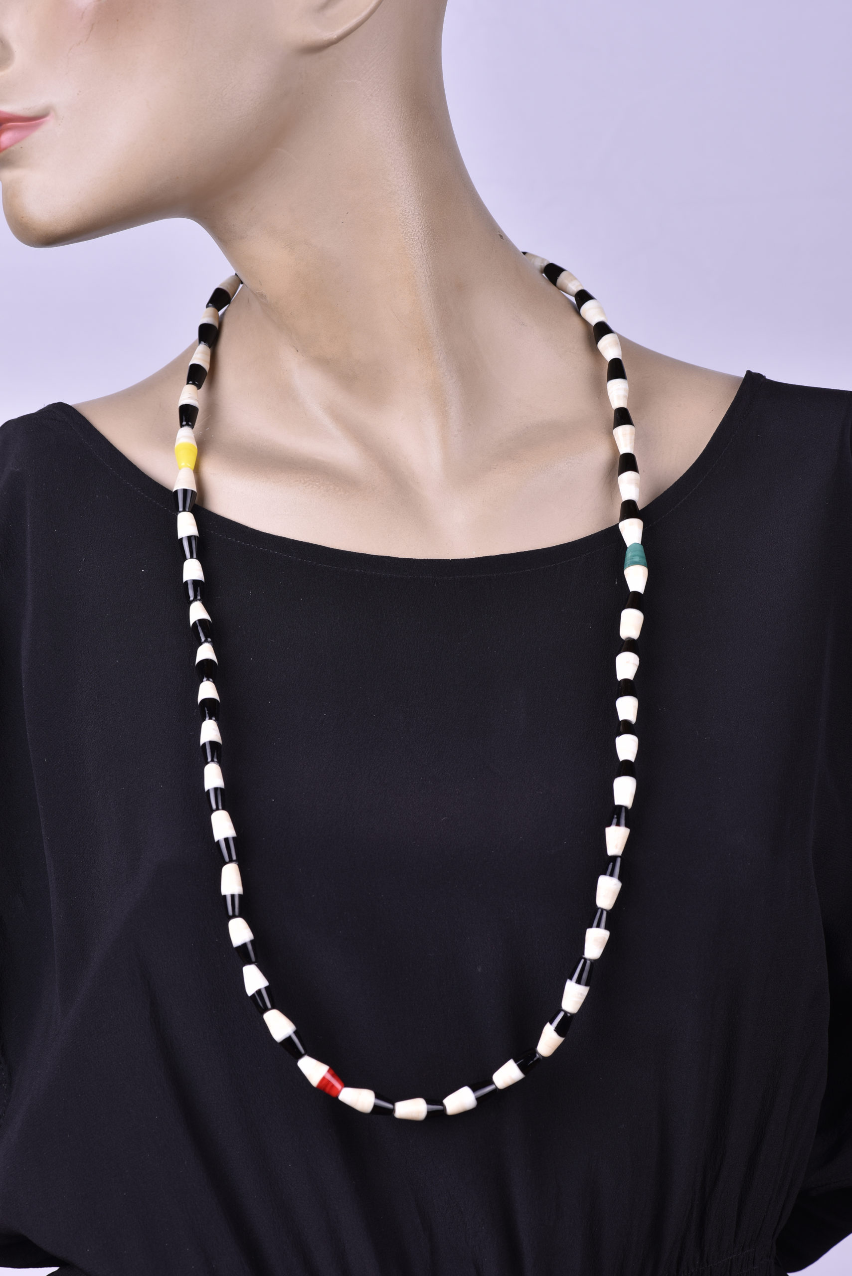 Ce sautoir raffiné en cristal de Murano composé de perle losange met en valeur la géométrie épurée de chaque perle en créant un contraste subtil entre ses deux teinte, l'ivoire chaleureux et le noir profond, révélant toute la virtuosité du travail à la flamme.