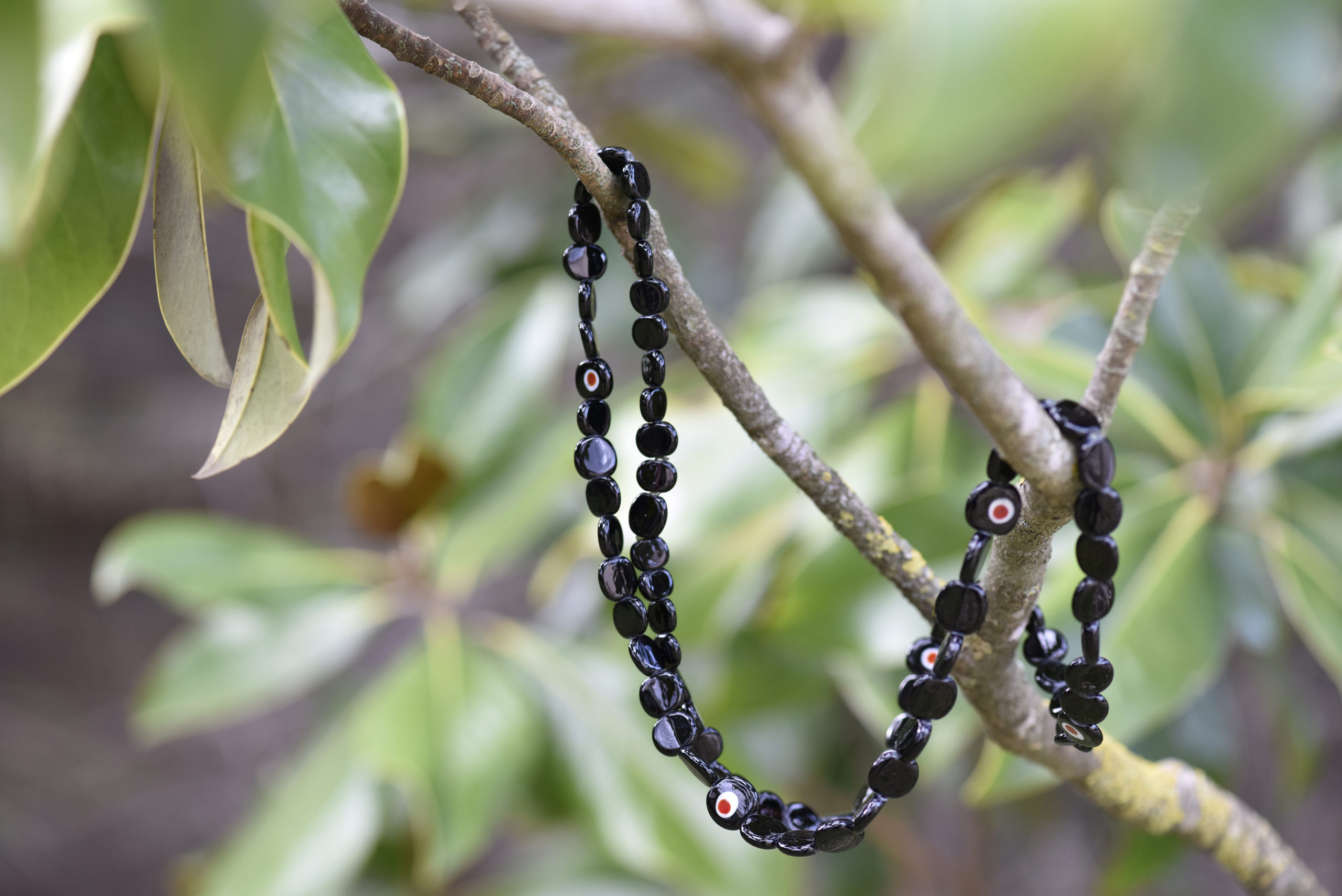 Collier perles rondes en Cristal de Murano Noire décors abstrait couleur Ivoire et Bleue