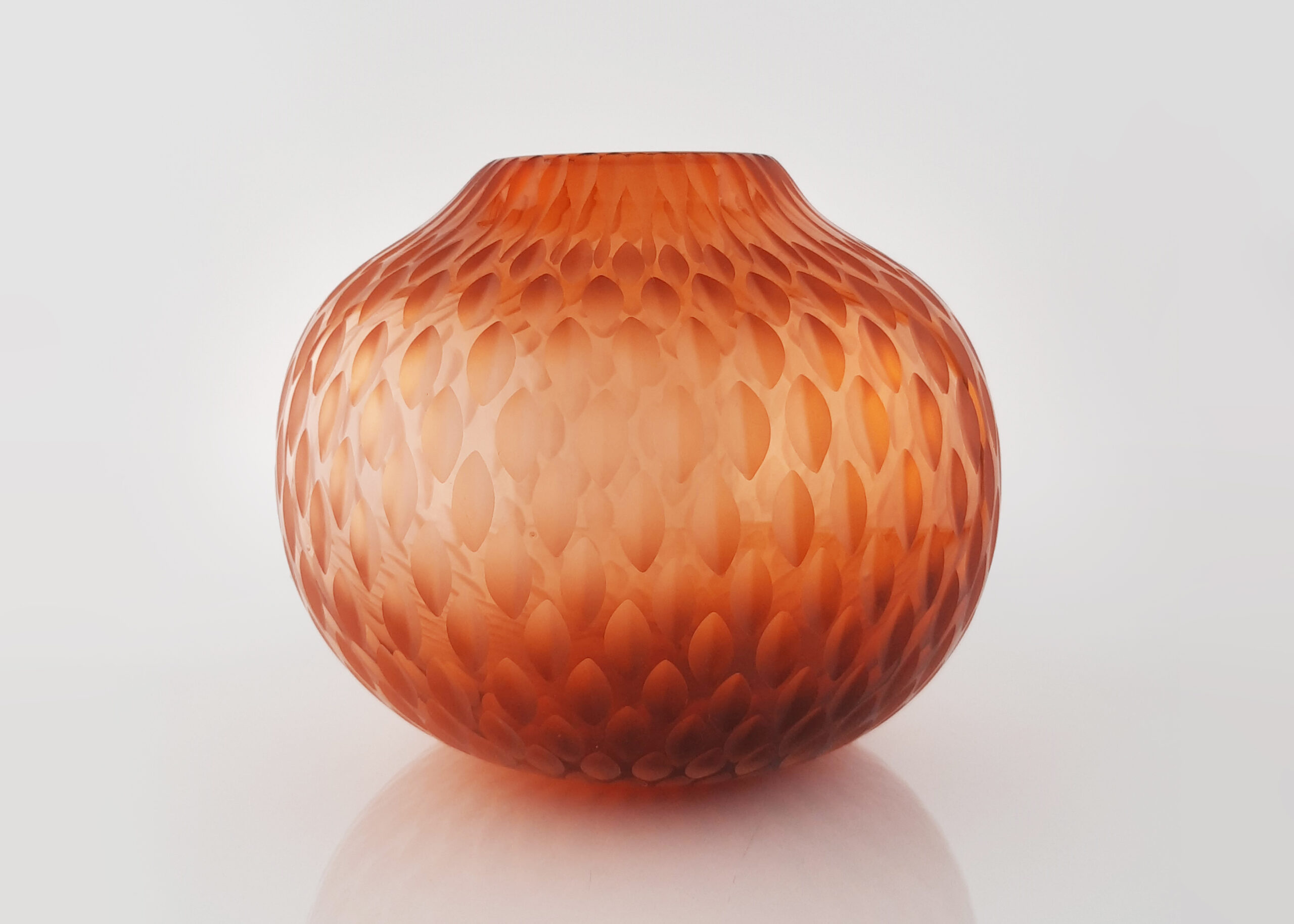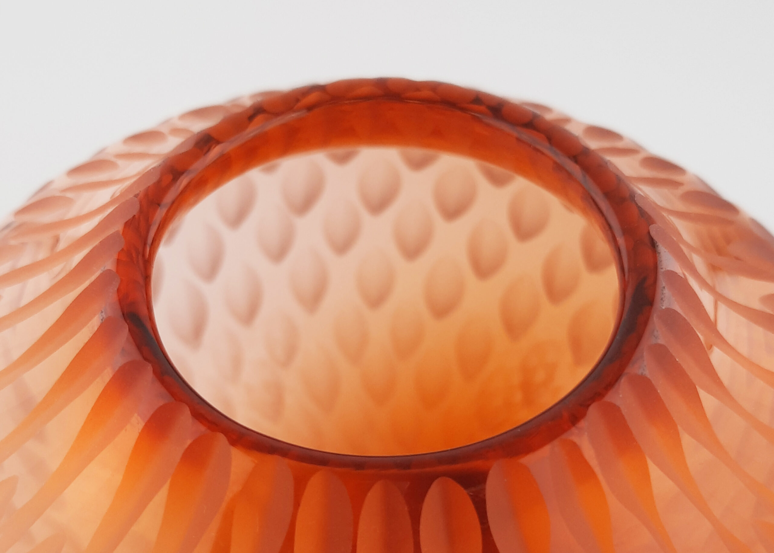 Pièce unique "Translucide", en verre soufflé bouche, formée à main levée, de couleur Aurore. Sculptée dans la masse au diamant. Effet Grain de Blé translucide et Satiné.