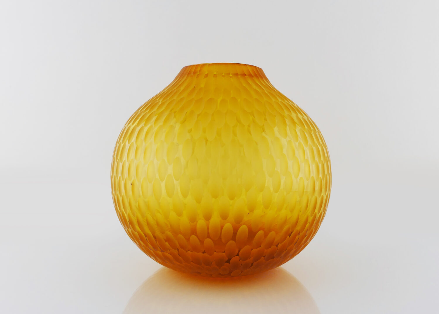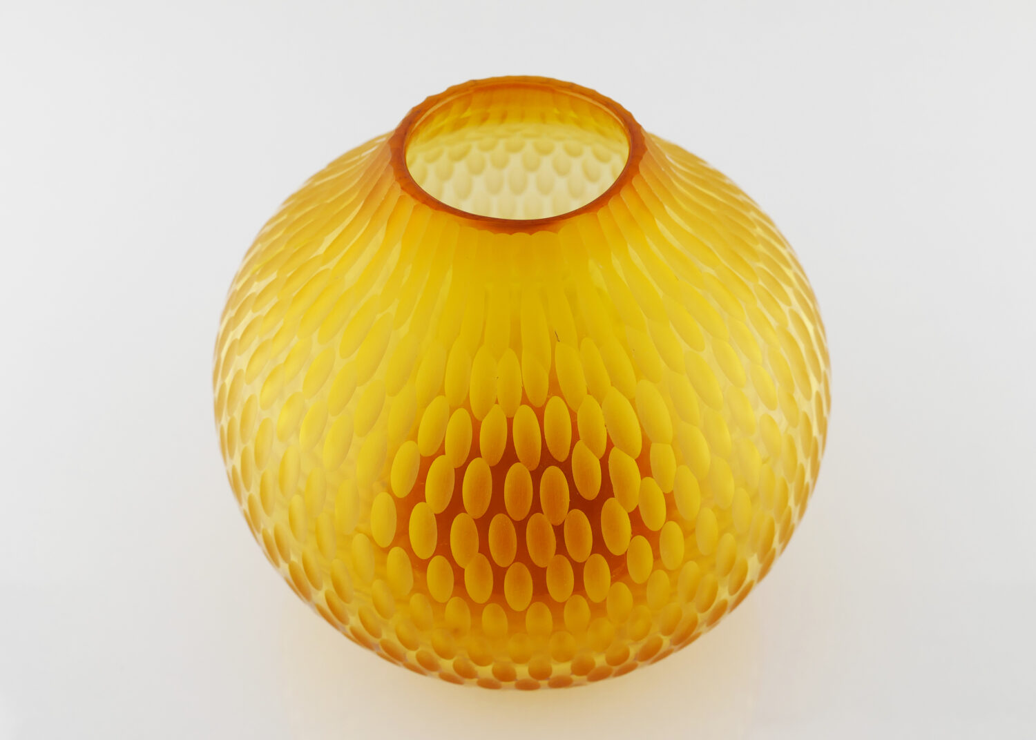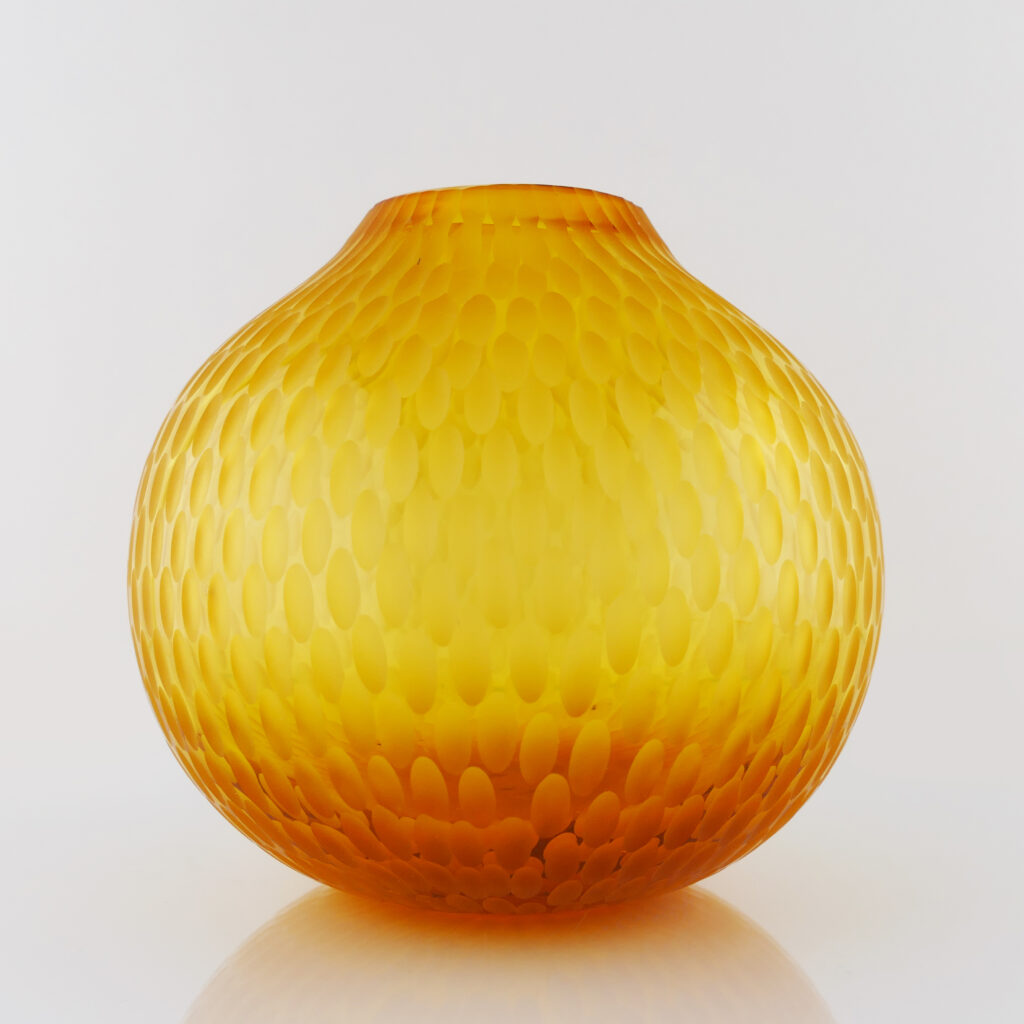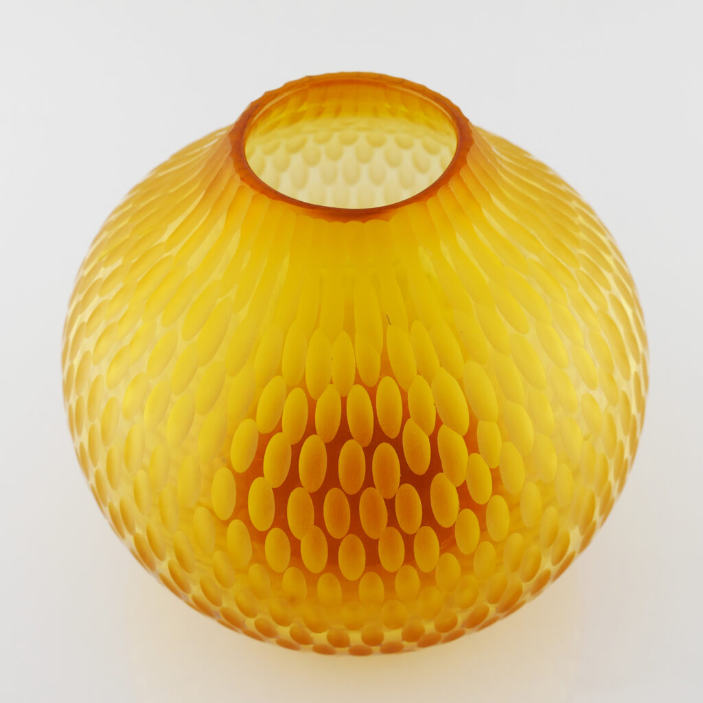 Pièce unique "Translucide" en verre soufflé bouche , formé à main levée, de couleur Jaune Doré. Sculptée dans la masse au diamant.