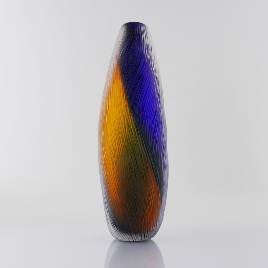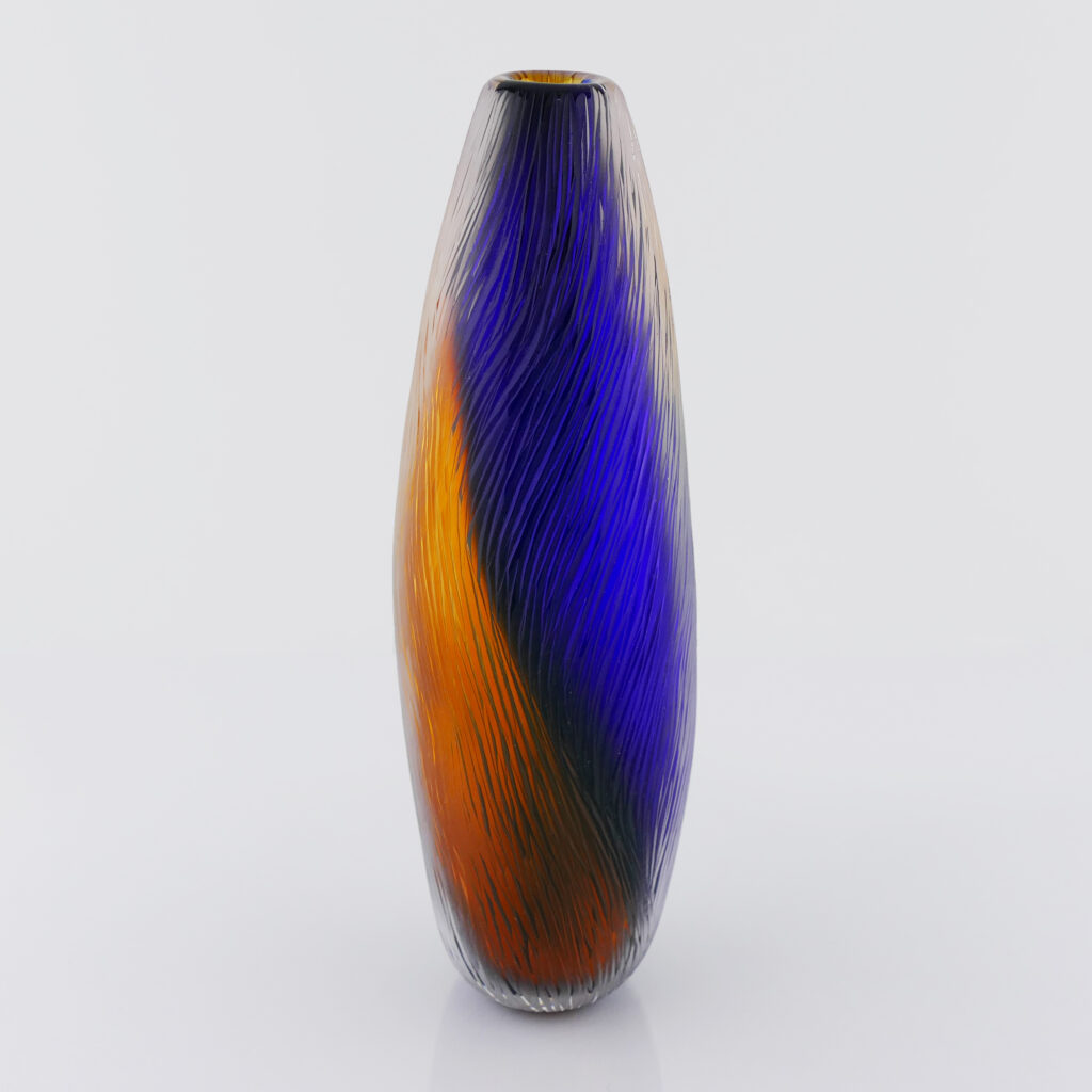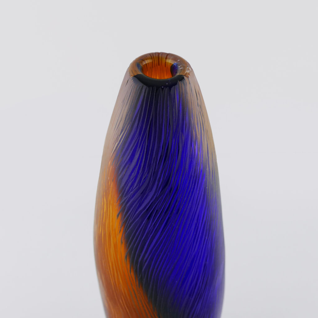 Vase Termite Bicolore verre soufflé bouche, formé à main levée, Bleu Intense et Topaze. Effet de mouvements ascensionnels