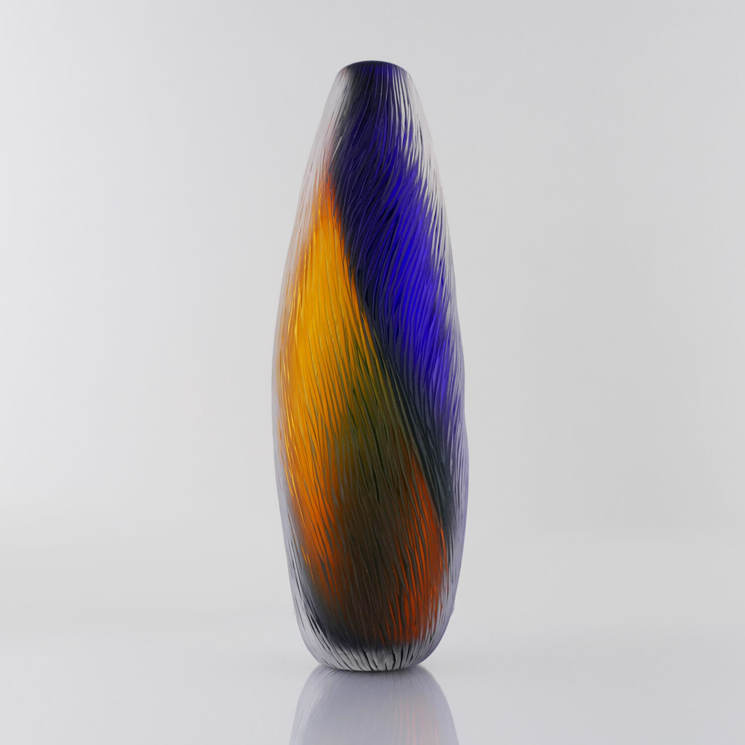 Translucide , Vase en verre soufflé bouche, formé à main levée Bleu Violine. Effet Banc de poisson