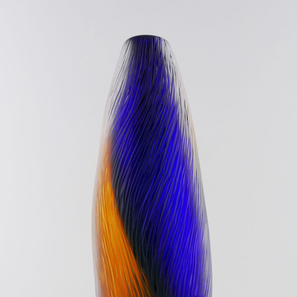 Pièce unique Termite Bicolore Bleu Intense et Topaze, en verre soufflé bouche, formée à main levée. Sculptée dans la masse au diamant.