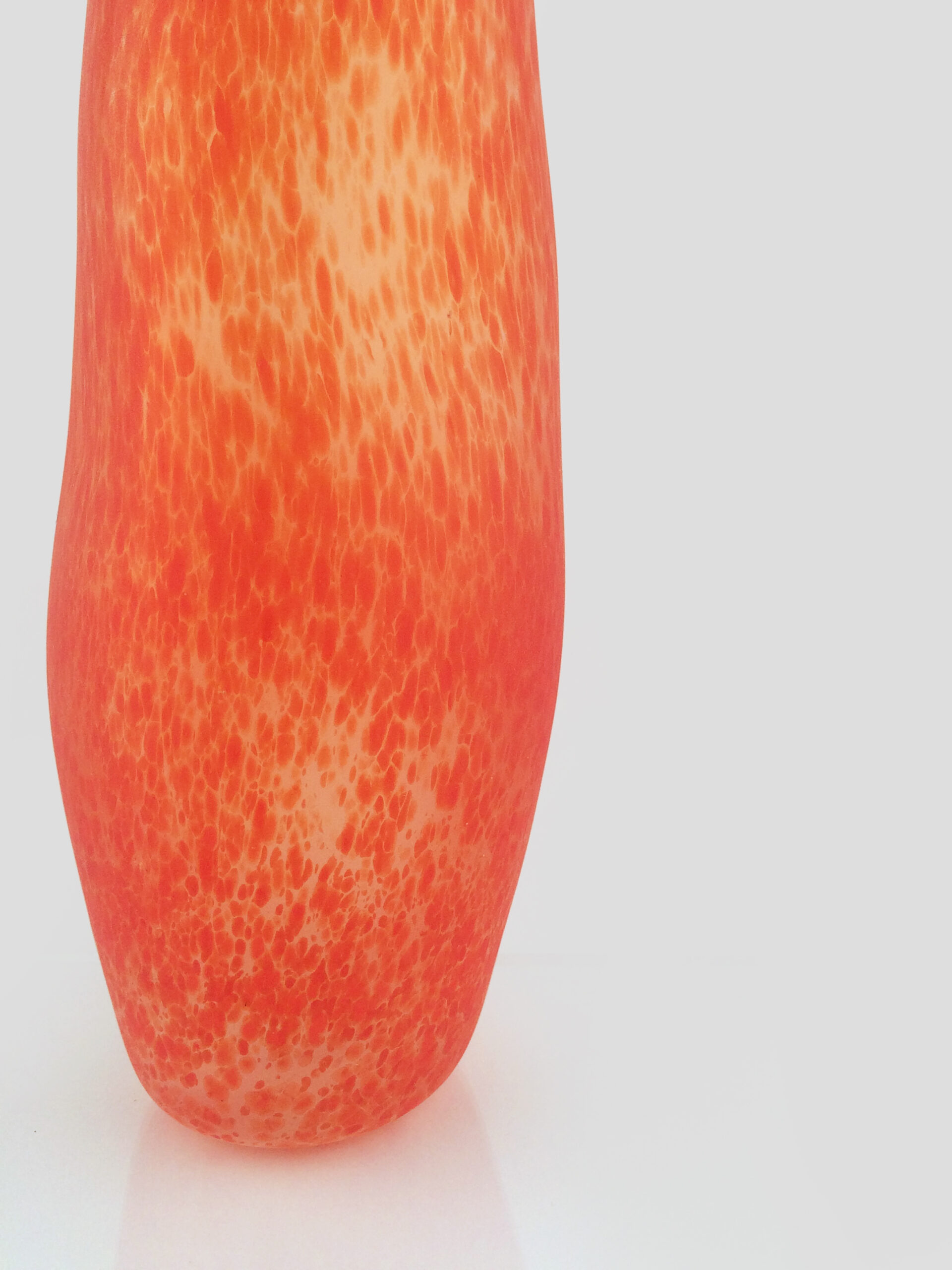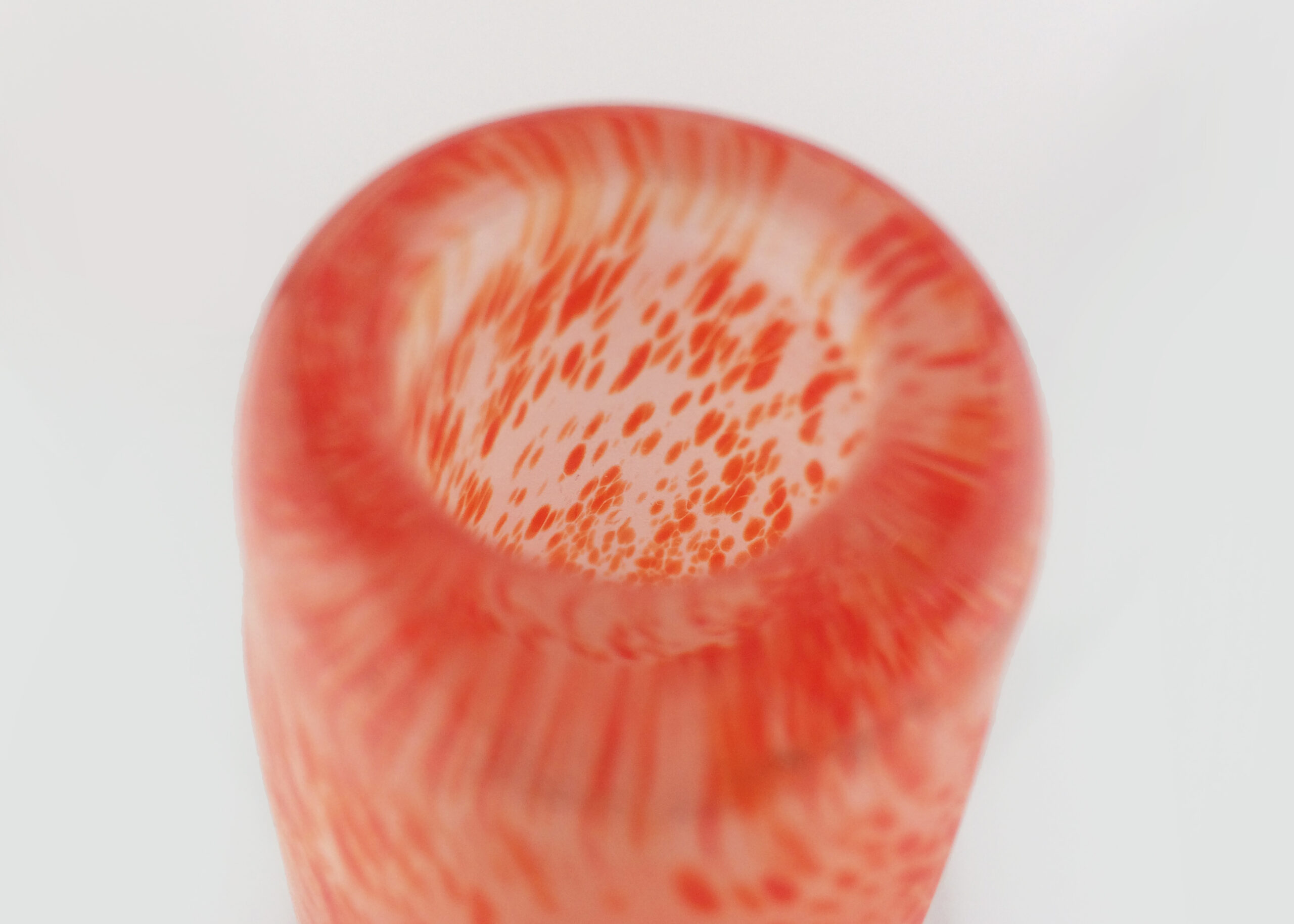 Pièce unique "Termite" en verre soufflé bouche, formée à main levée, de couleur Blanche, moucheté Rouge, Sablage.