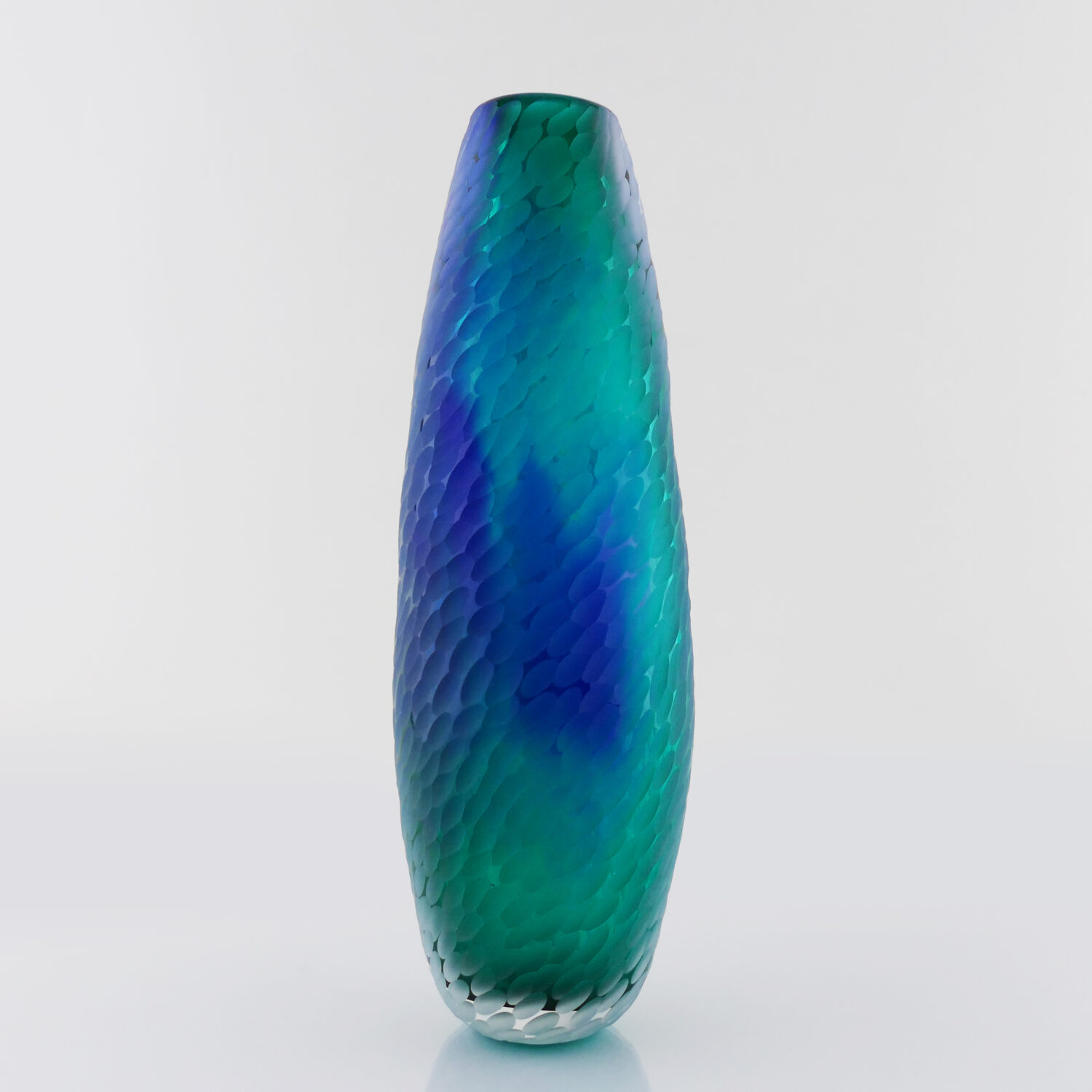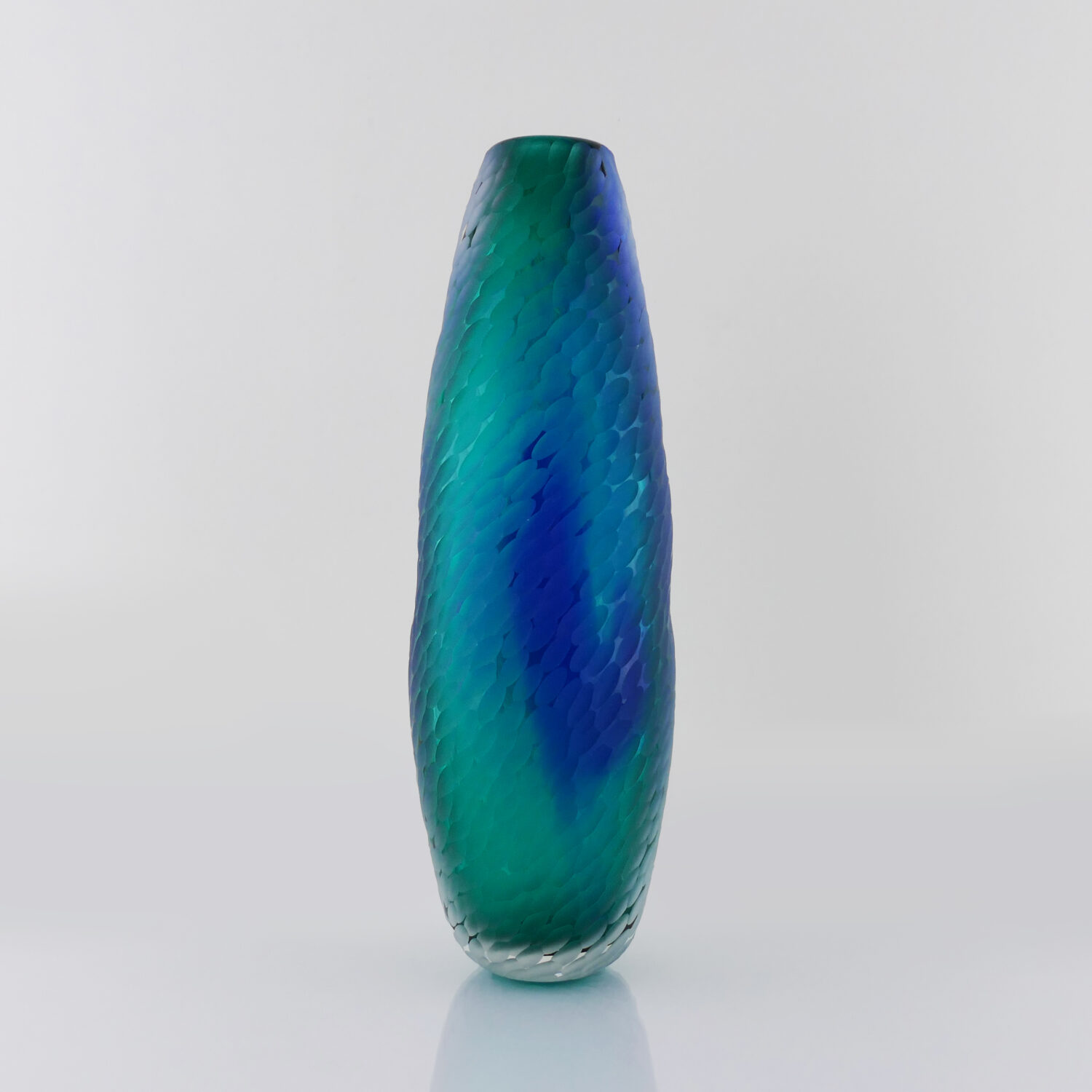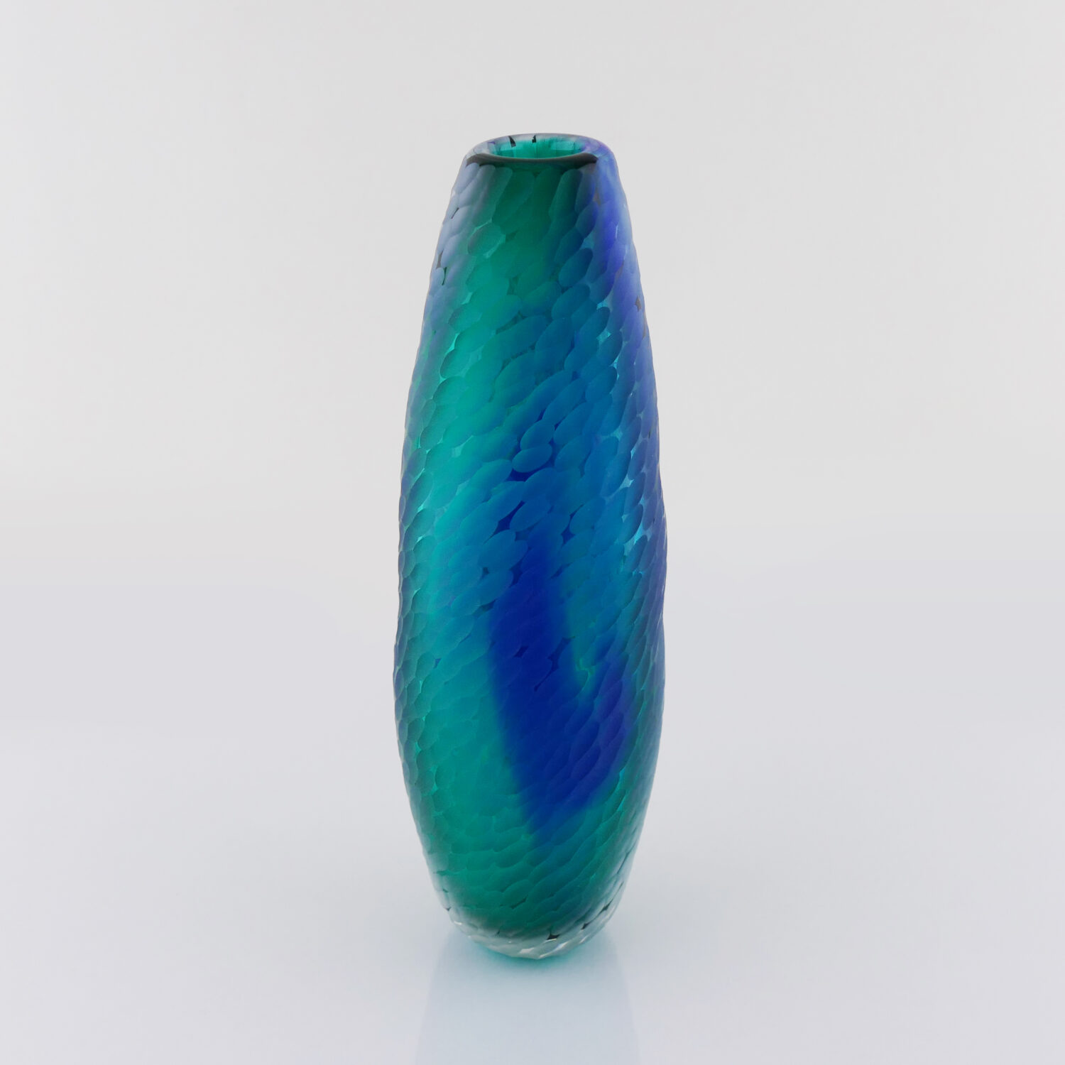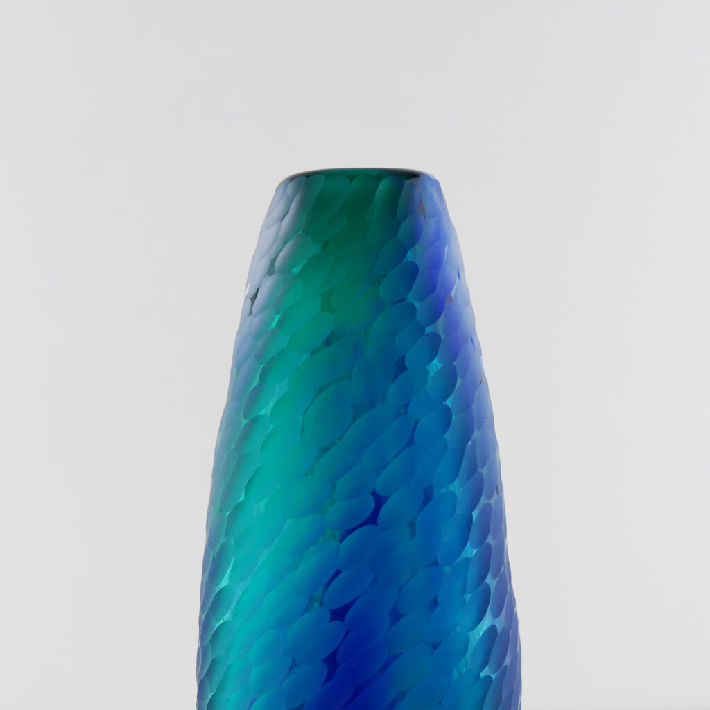 Translucide, Vase en verre soufflé bouche, formé à main levée de couleur Vert Lagon et Bleu. Effet écaille translucide satinée et aérien